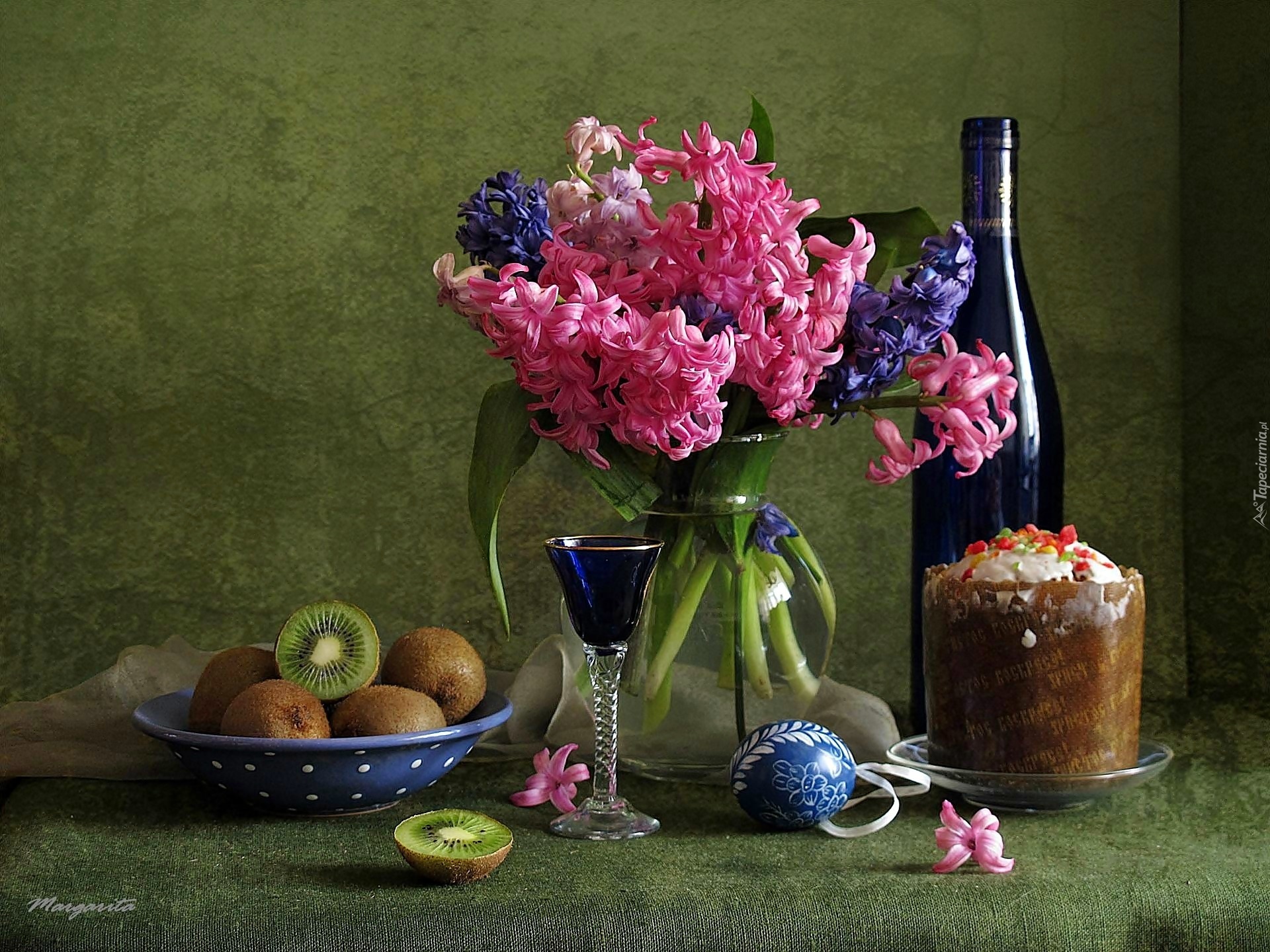 Edytor tapety: Bukiet, Hiacyntów, Czerwone, Wino, Kiwi, Ciastko, Pisanka
