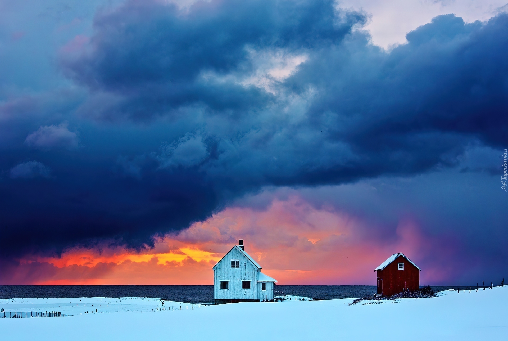 Edytor tapety: Zachód, Słońca, Domy, Chmury, Morze