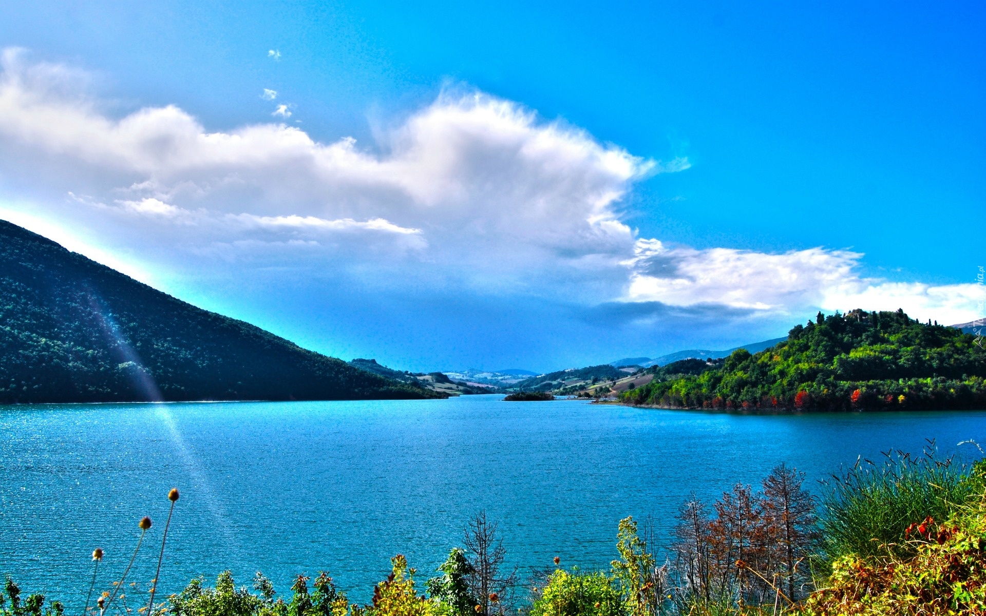 Edytor tapety: Rzeka, Wysepka, Góry, Lasy, Chmury, Promienie