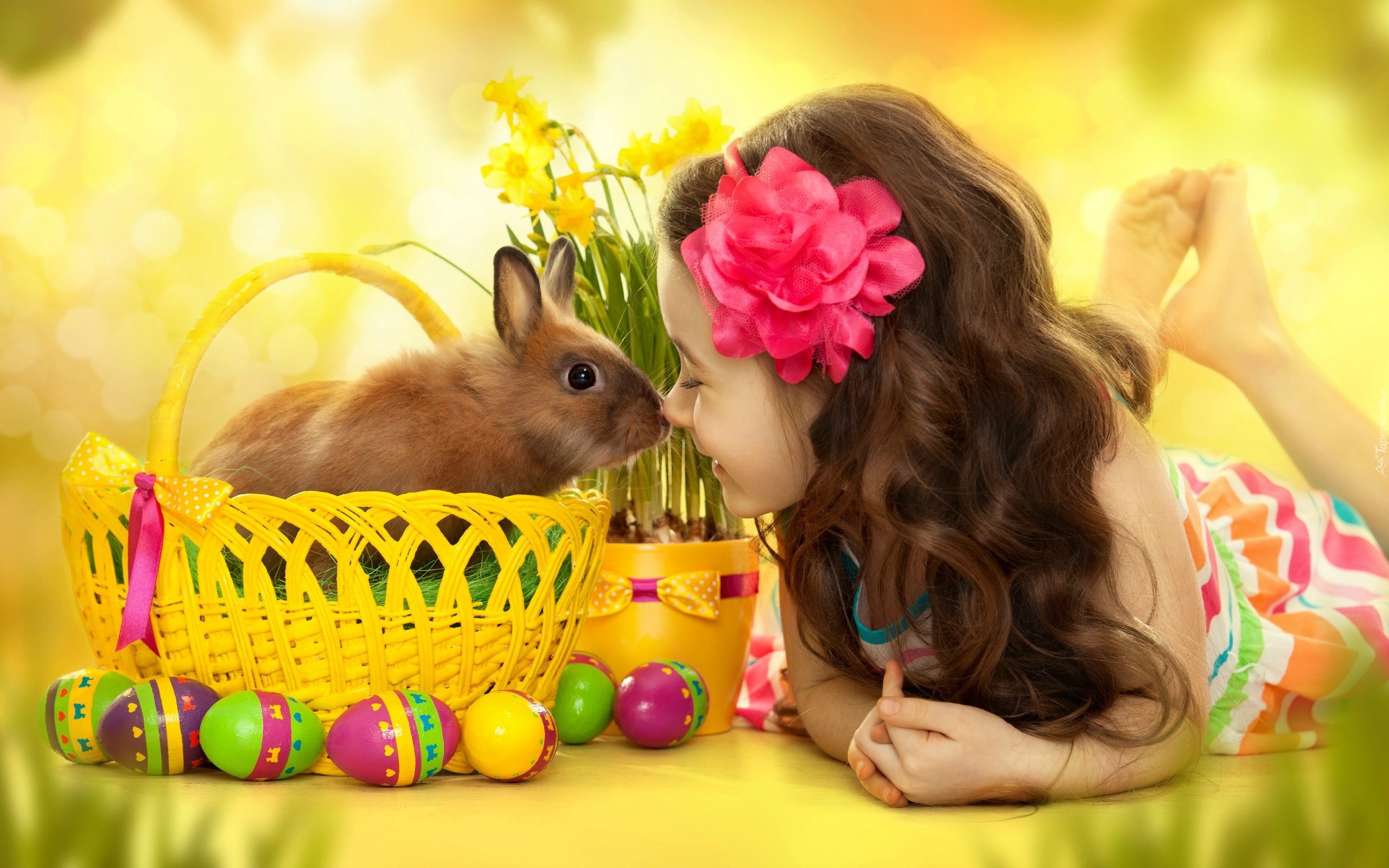 Edytor tapety: Dziewczynka, Królik, Koszyk, Jajka, Kwiaty, Wielkanoc