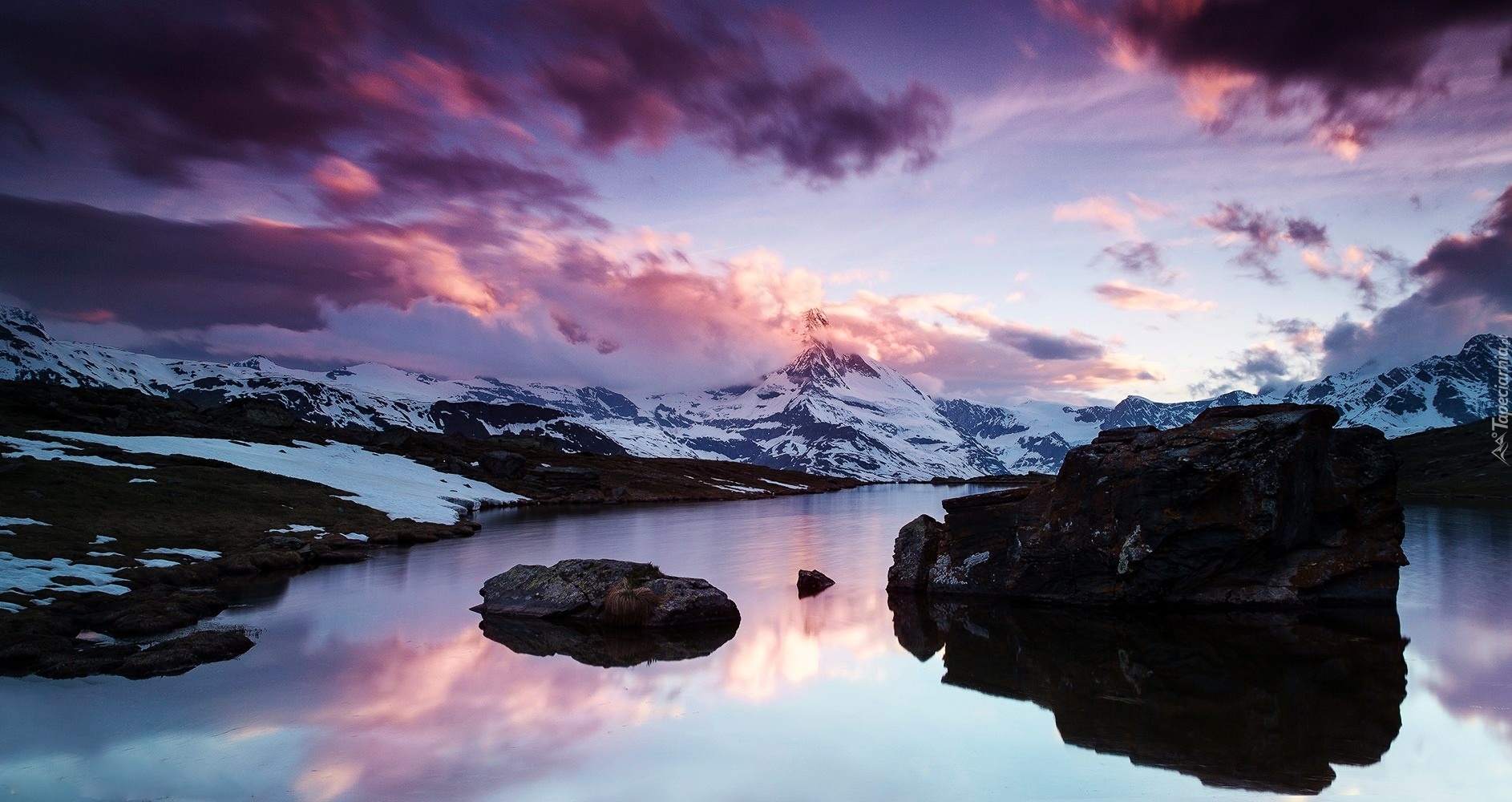 Edytor tapety: Zachód, Słońca, Jezioro, Skały