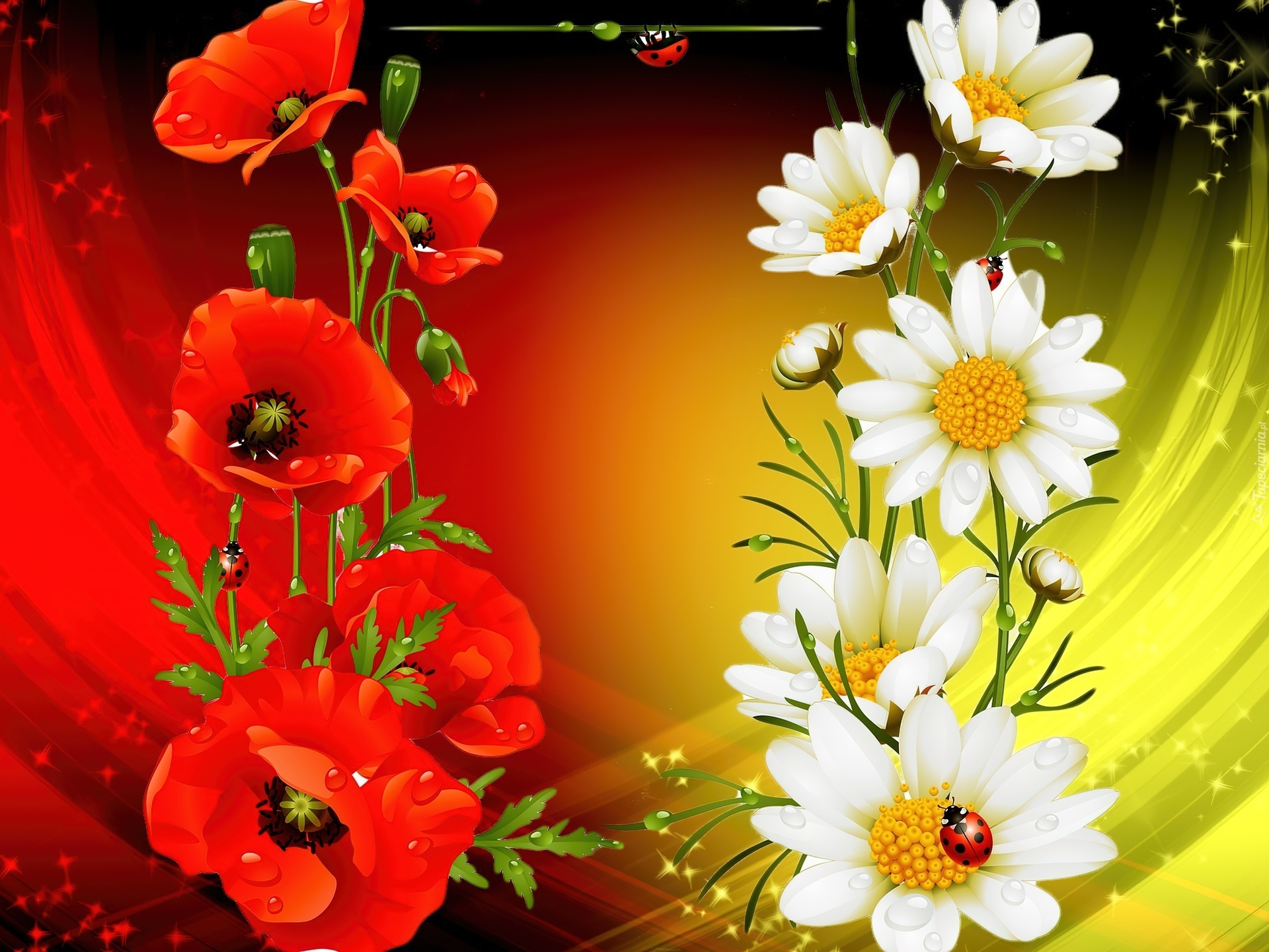 Edytor tapety: Kwiaty, Maki, Rumianki, Biedronki, Art