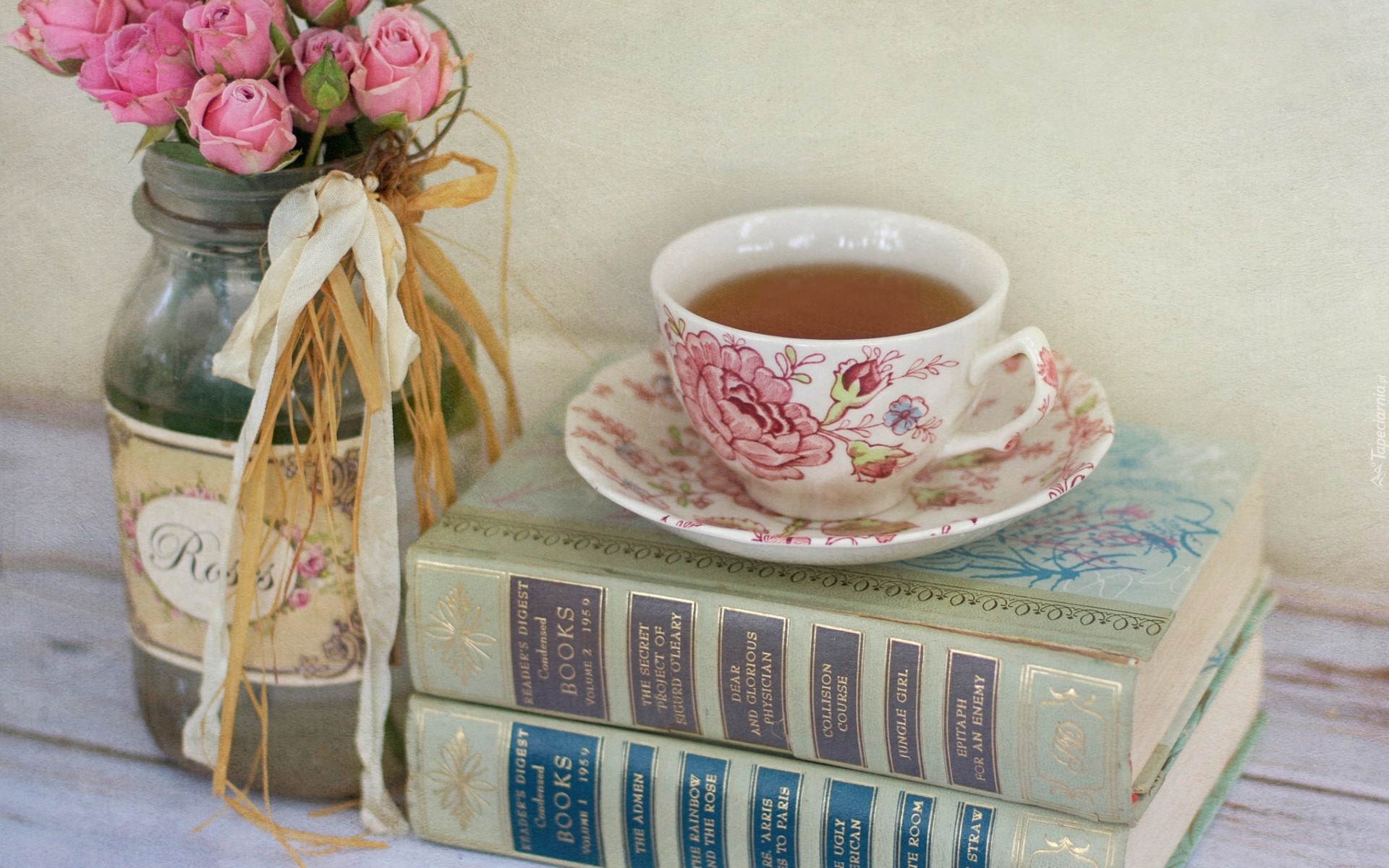 Edytor tapety: Książki, Herbata, Filiżanka Bukiet, Róże