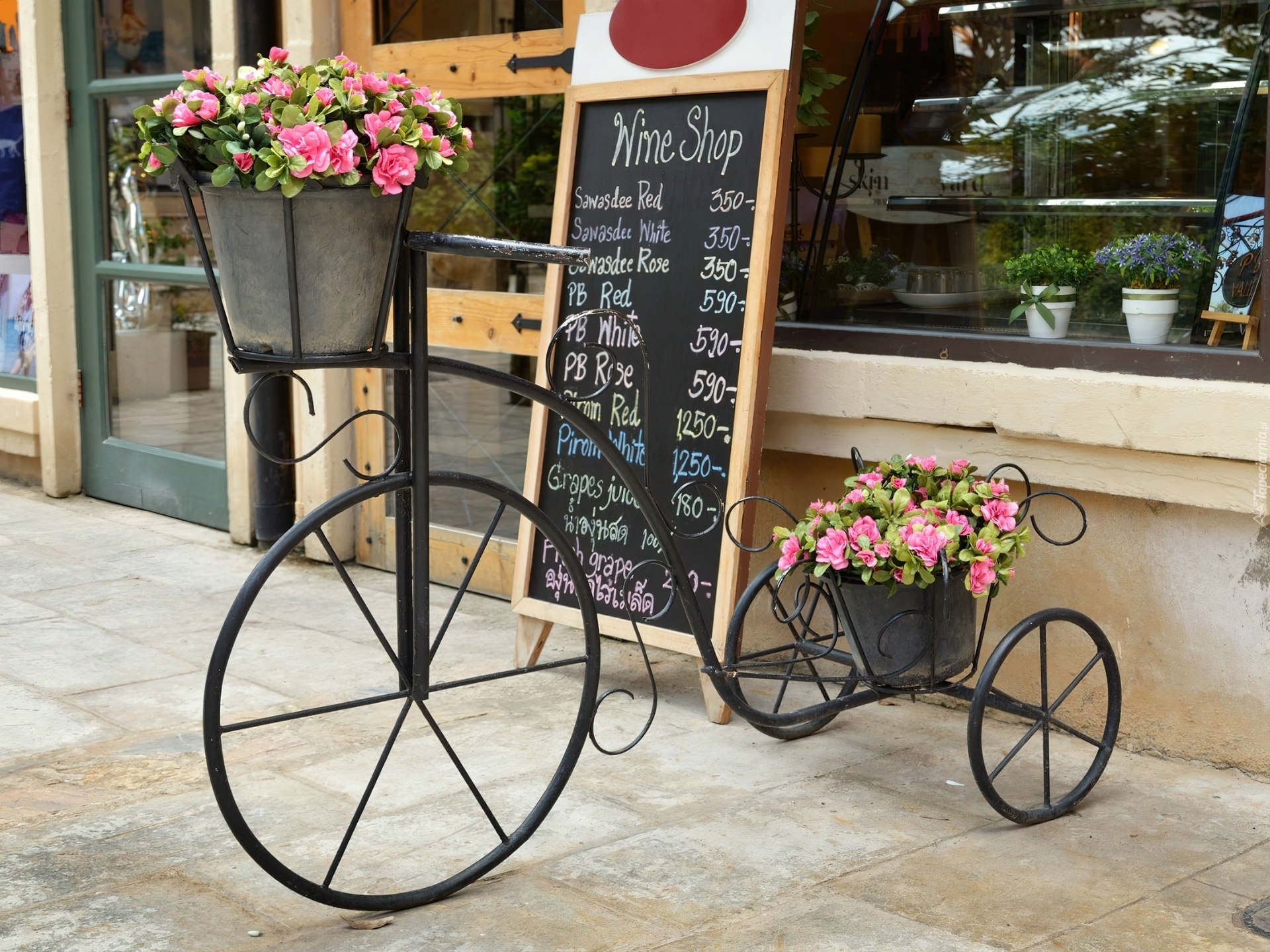 Edytor tapety: Rower, Ozdoba, Sklepu, Donice, Kwiaty, Ulica