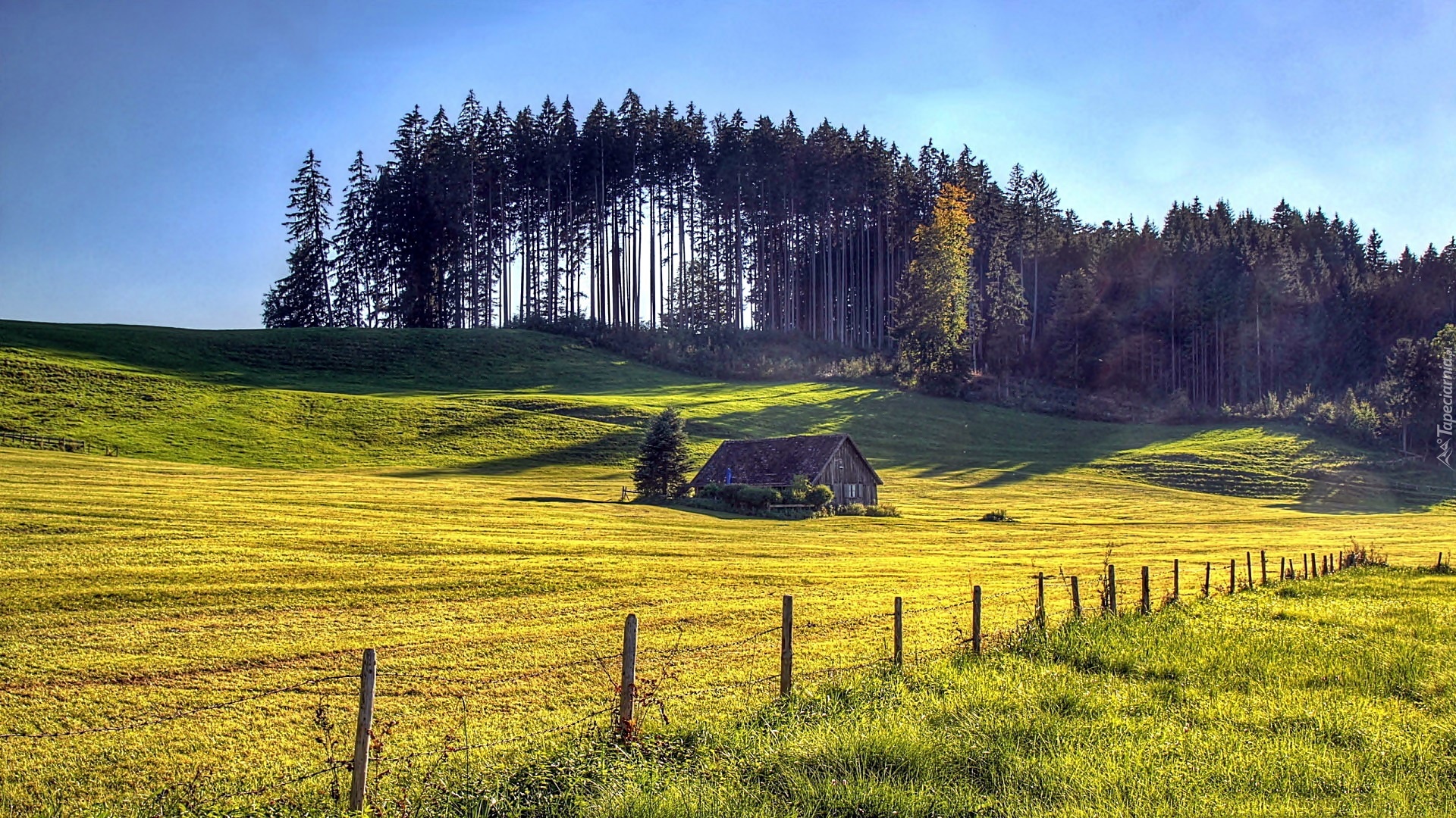 Edytor tapety: Lato, Pole, Łąka, Las, Dom, Przebijające, Światło