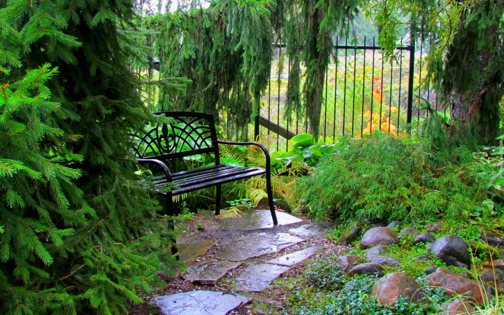 Edytor tapety: Ogródek, Świerki, Kamienie, Ławka, Płot