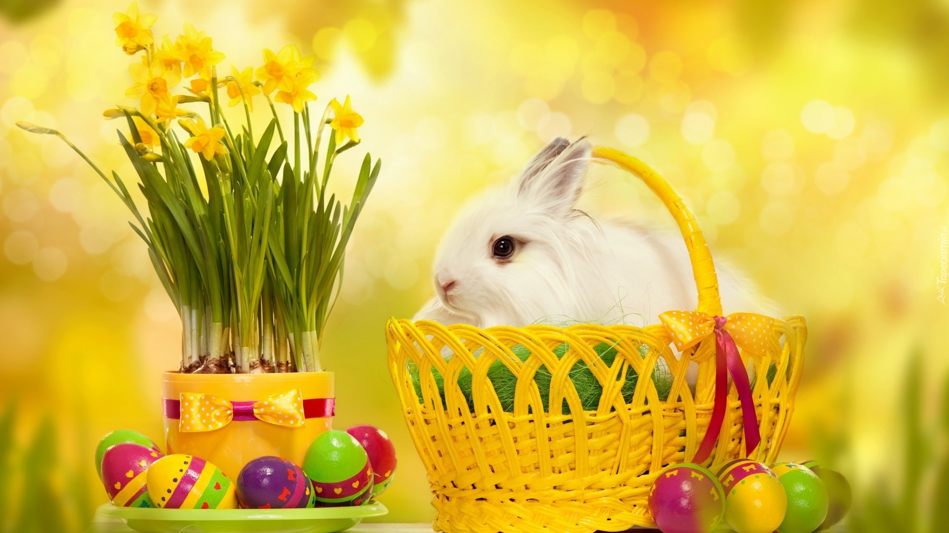 Edytor tapety: Wielkanoc, Zając, Pisanki, Żonkile, Koszyczek