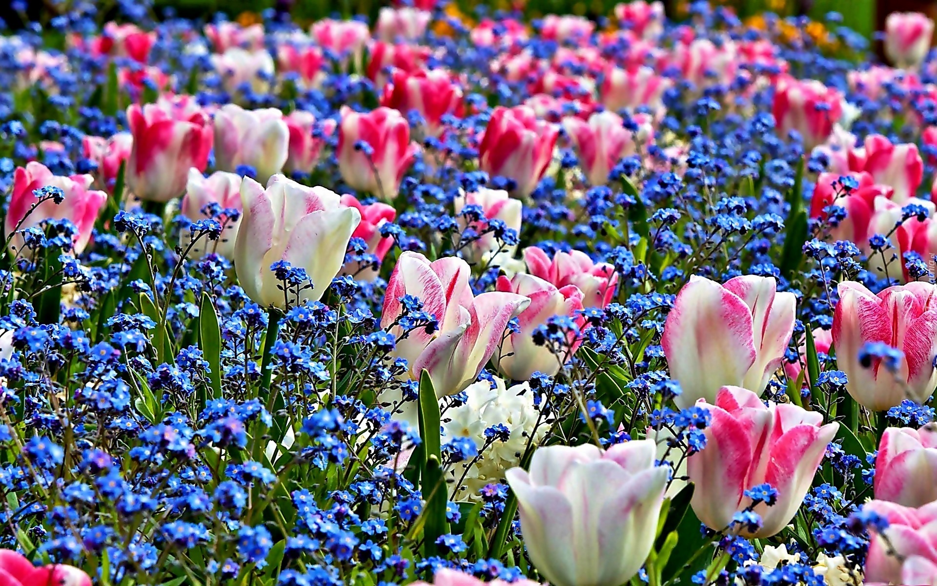 Edytor tapety: Wiosna, Ogród, Tulipany, Niezapominajki