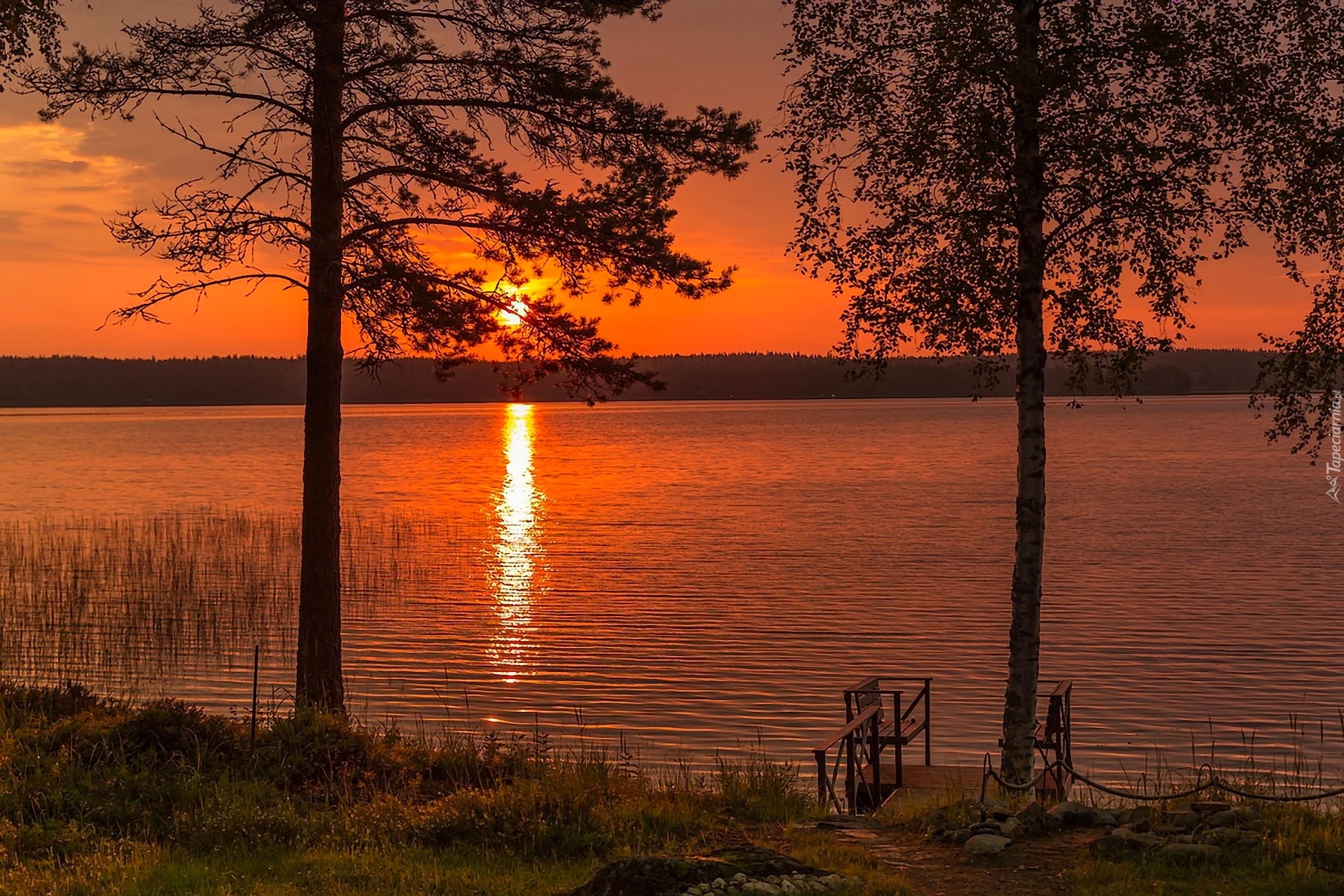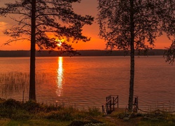 Edytor tapety: Drzewa, Mostek, Jezioro, Zachód, Słońca