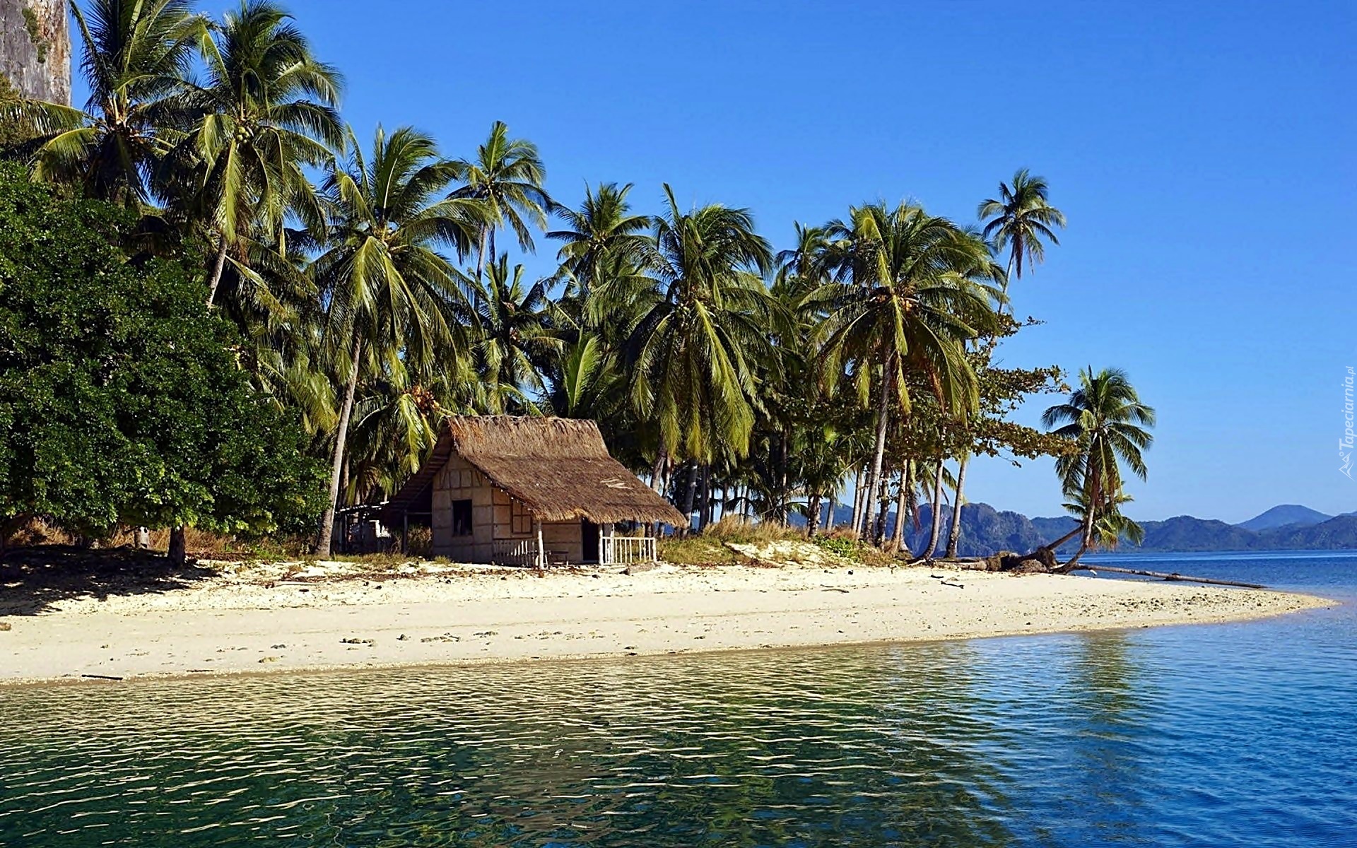 Edytor tapety: Tropiki, Górzyste, Wyspy, Morze, Plaża, Domek, Palmy