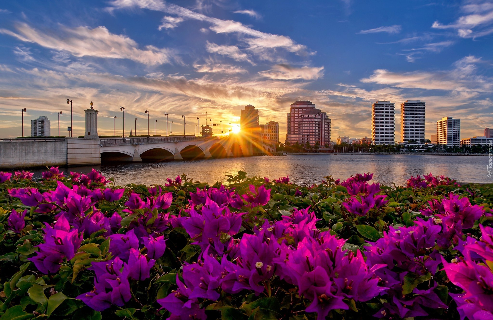 Edytor tapety: Rzeka, Most, Kwiaty, Wieżowce, Promienie, Słońca, Panorama, Miasta