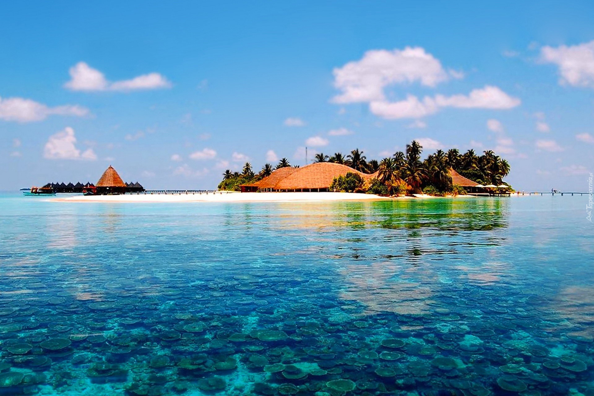 Edytor tapety: Wyspa, Domy, Palmy, Morze, Tropiki