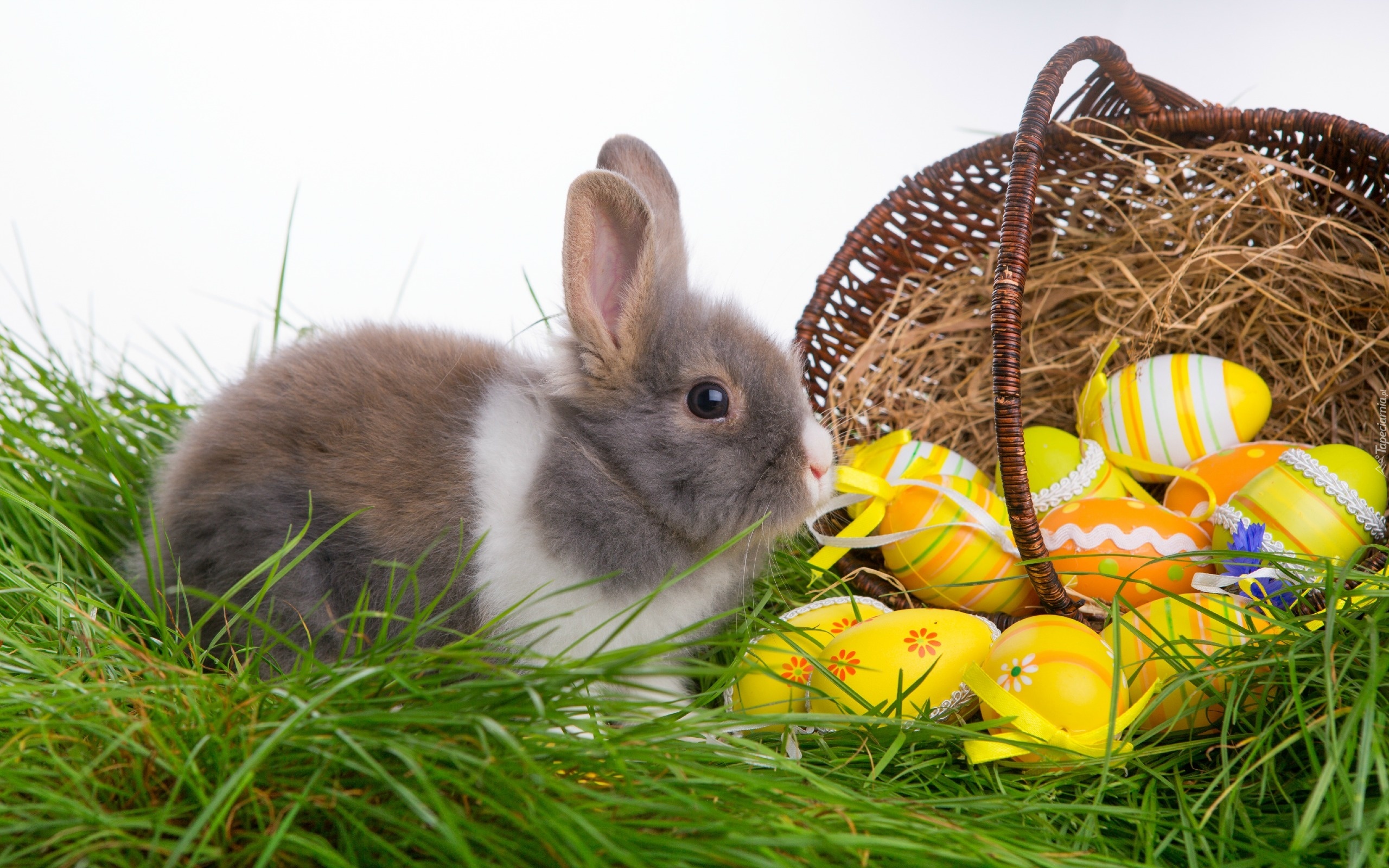 Edytor tapety: Królik, Kosz, Pisanki, Siano, Trawa, Wielkanoc