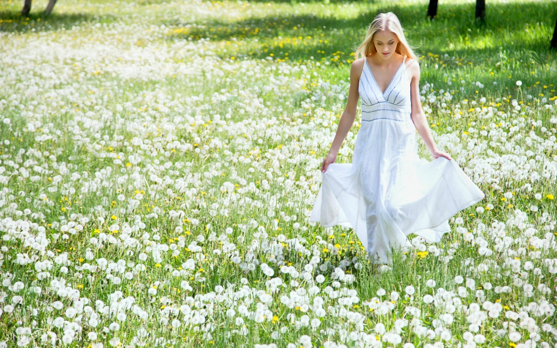 Edytor tapety: Blondynka, Biała, Sukienka, Łąka, Mlecze, Wiosna