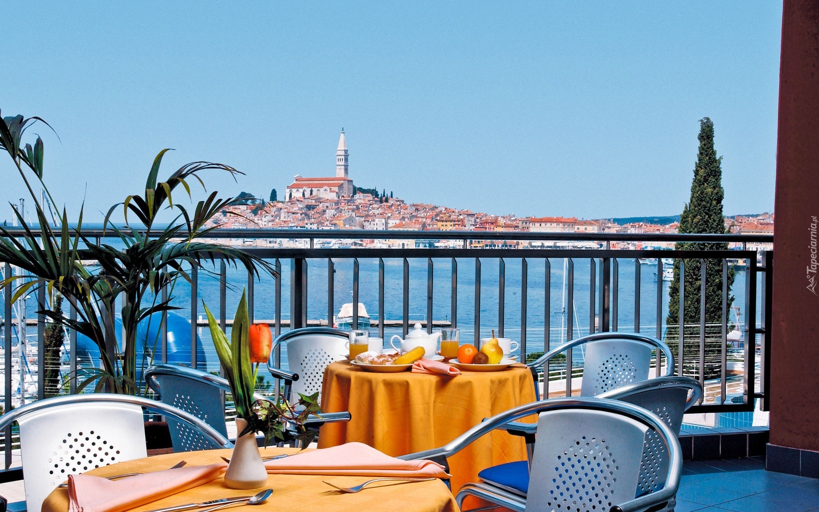 Edytor tapety: Taras, Meble, Morze, Miasteczko