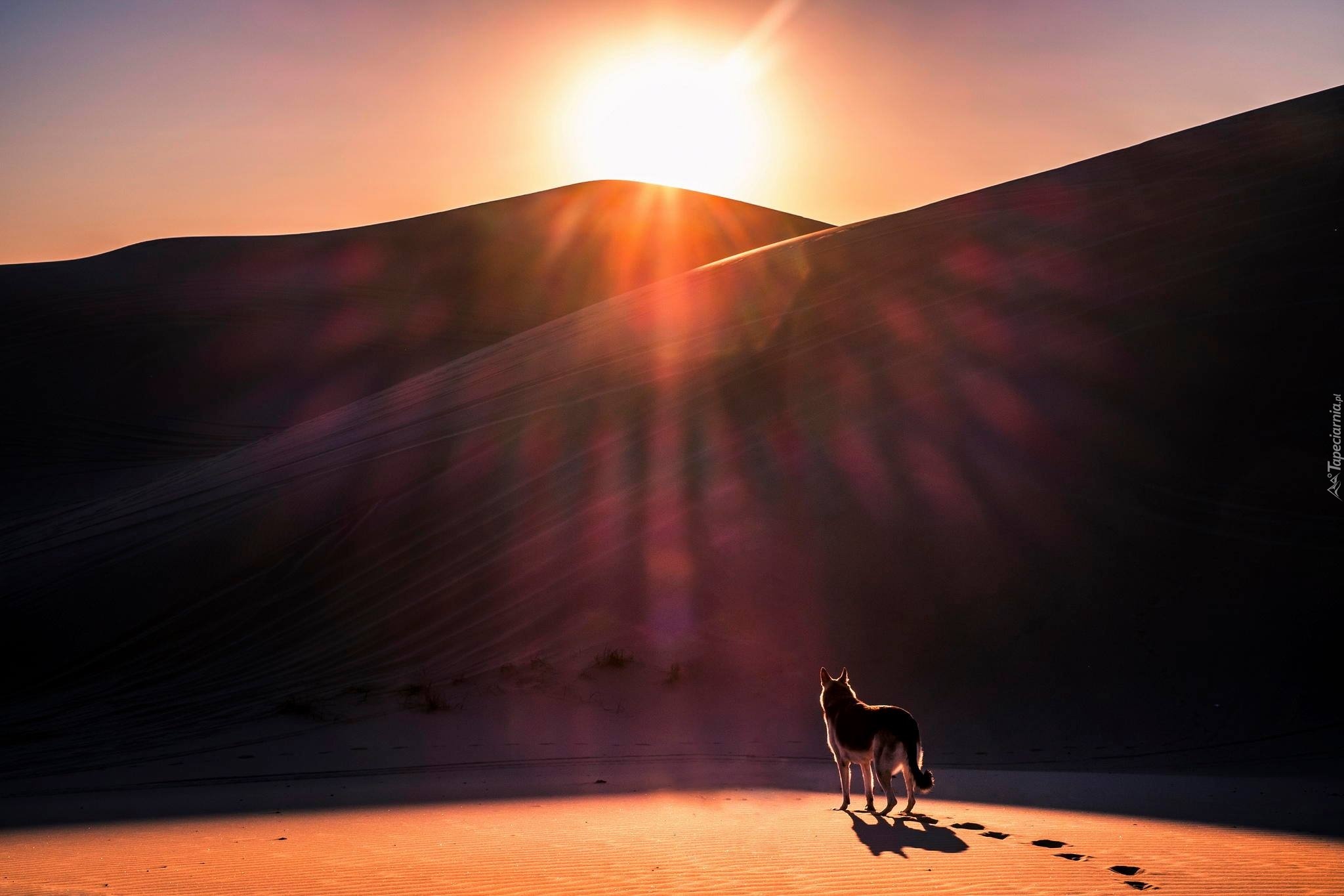 Edytor tapety: Zachód, Słońca, Pies, Góry, Piasek, Ślady