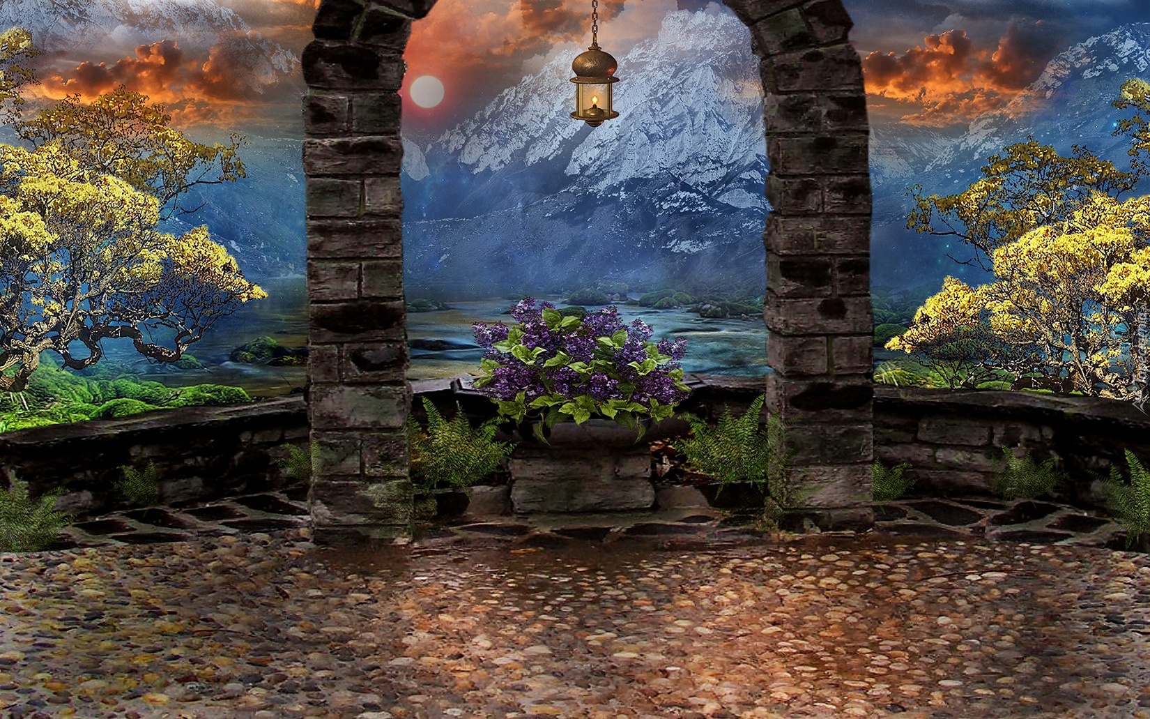 Edytor tapety: Abstrakcja, Widok, Góry, Taras, Lampion, Bez
