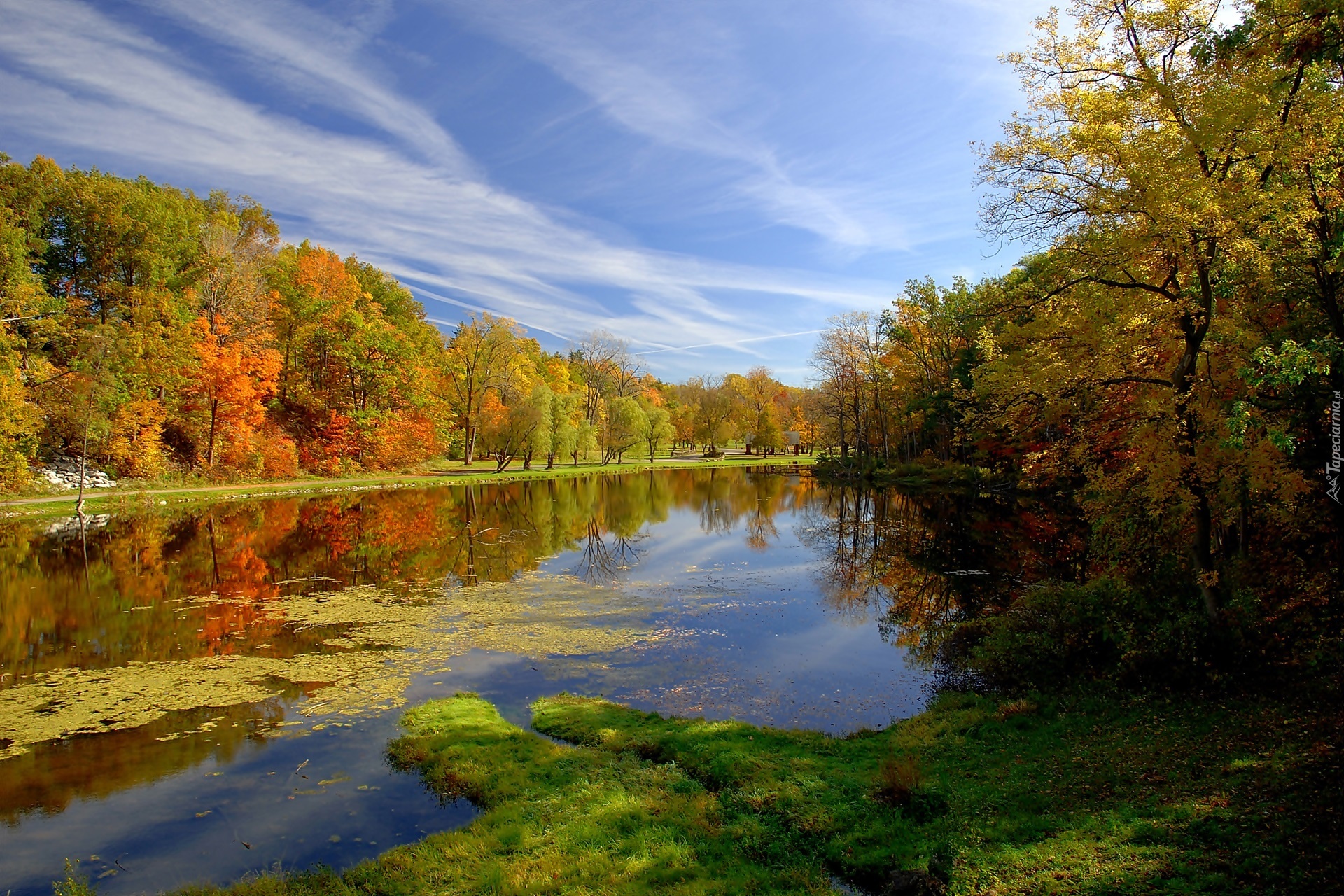Edytor tapety: Jesień, Chmury, Park, Rzeka, Odbicie