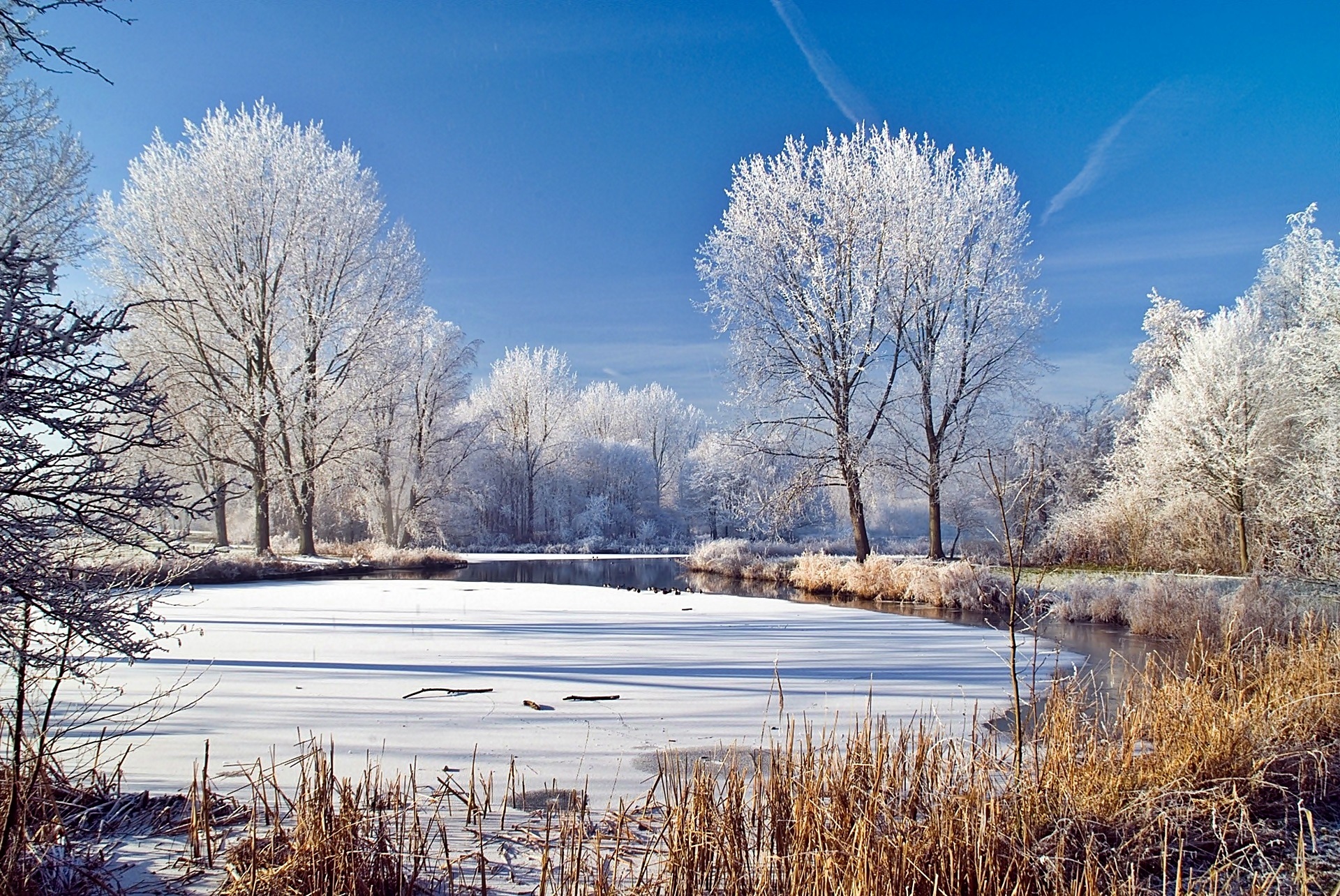 Edytor tapety: Zima Las, Oszronione, Drzewa, Jezioro