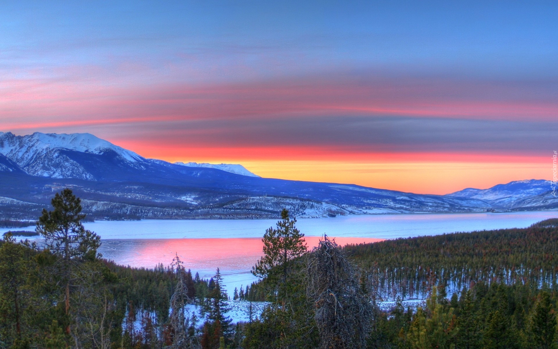 Edytor tapety: Zachód, Słońca, Jezioro, Góry, Śnieg, Drzewa