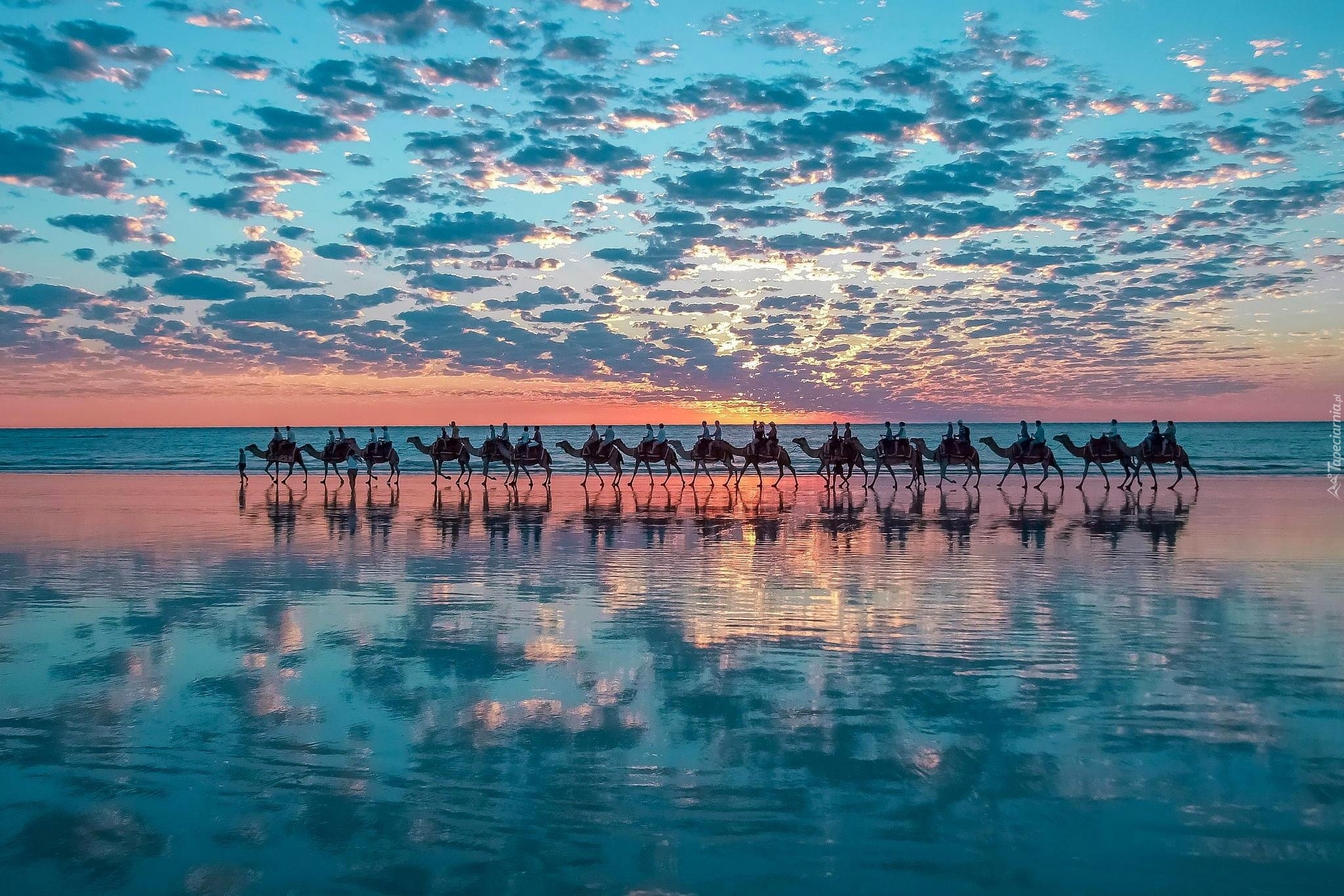 Edytor tapety: Wielbłądy, Zachód, Słońca, Morze, Odbicie