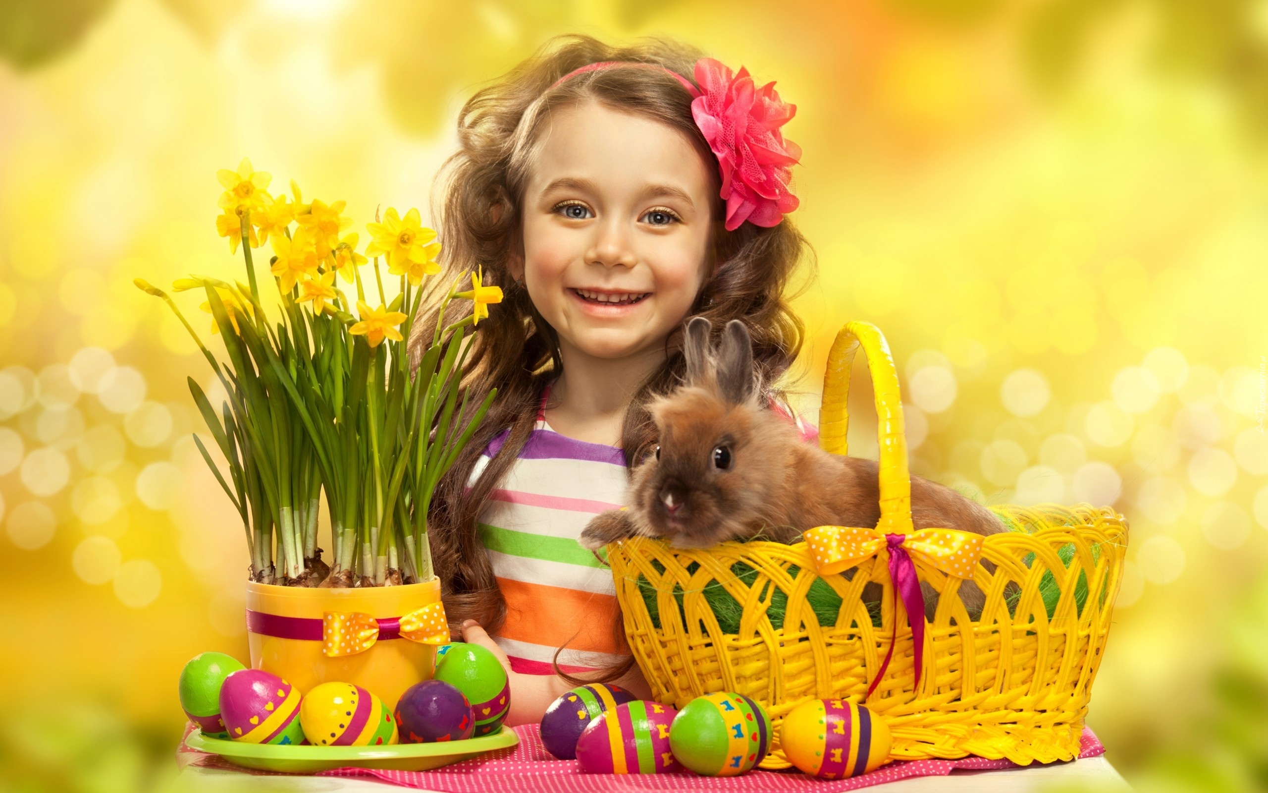 Edytor tapety: Wielkanoc, Jajka, Dziewczynka, Koszyk, Królik, Żonkile