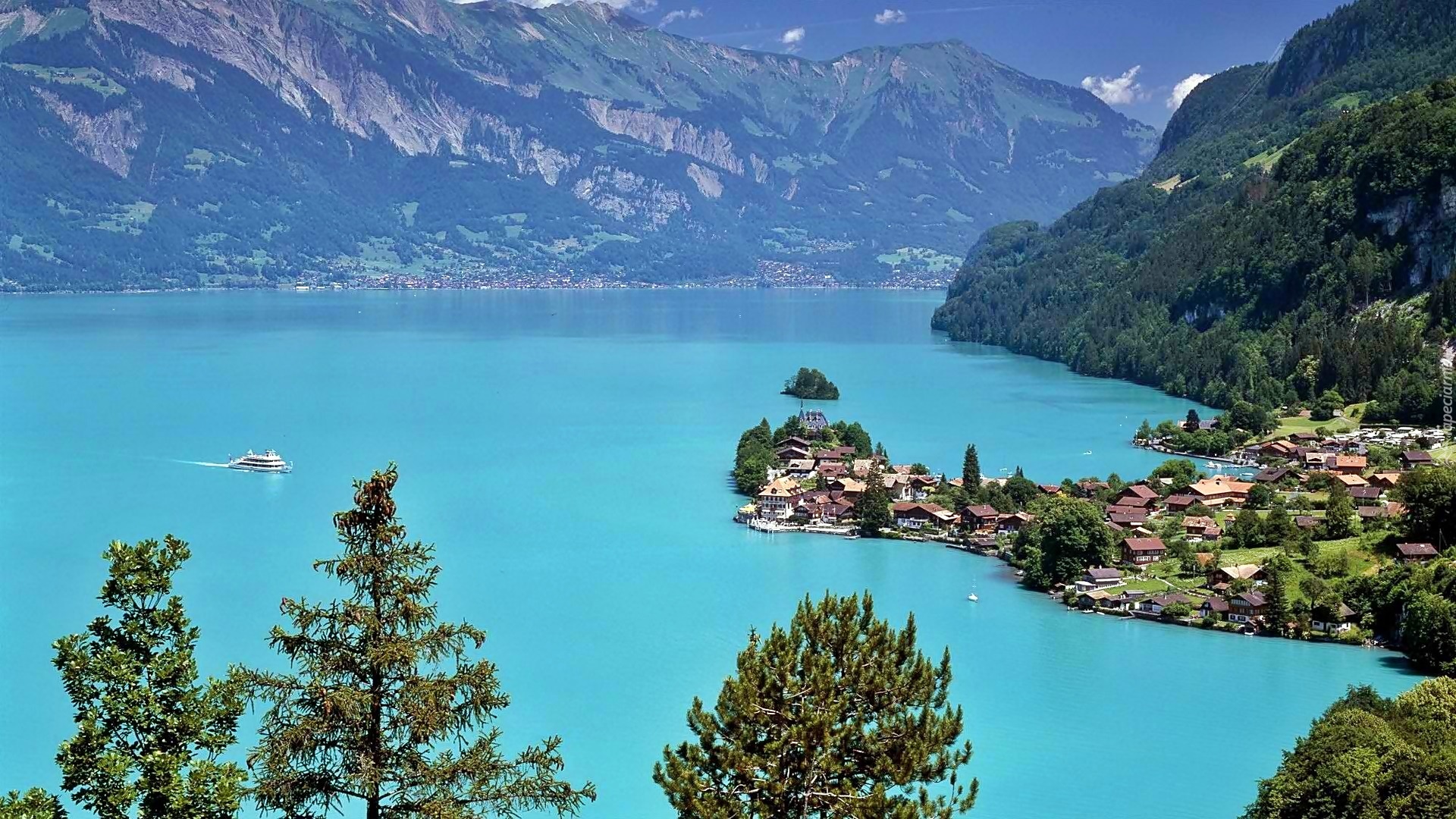 Edytor tapety: Góry, Lasy, Jezioro, Wioska, Rozmycie