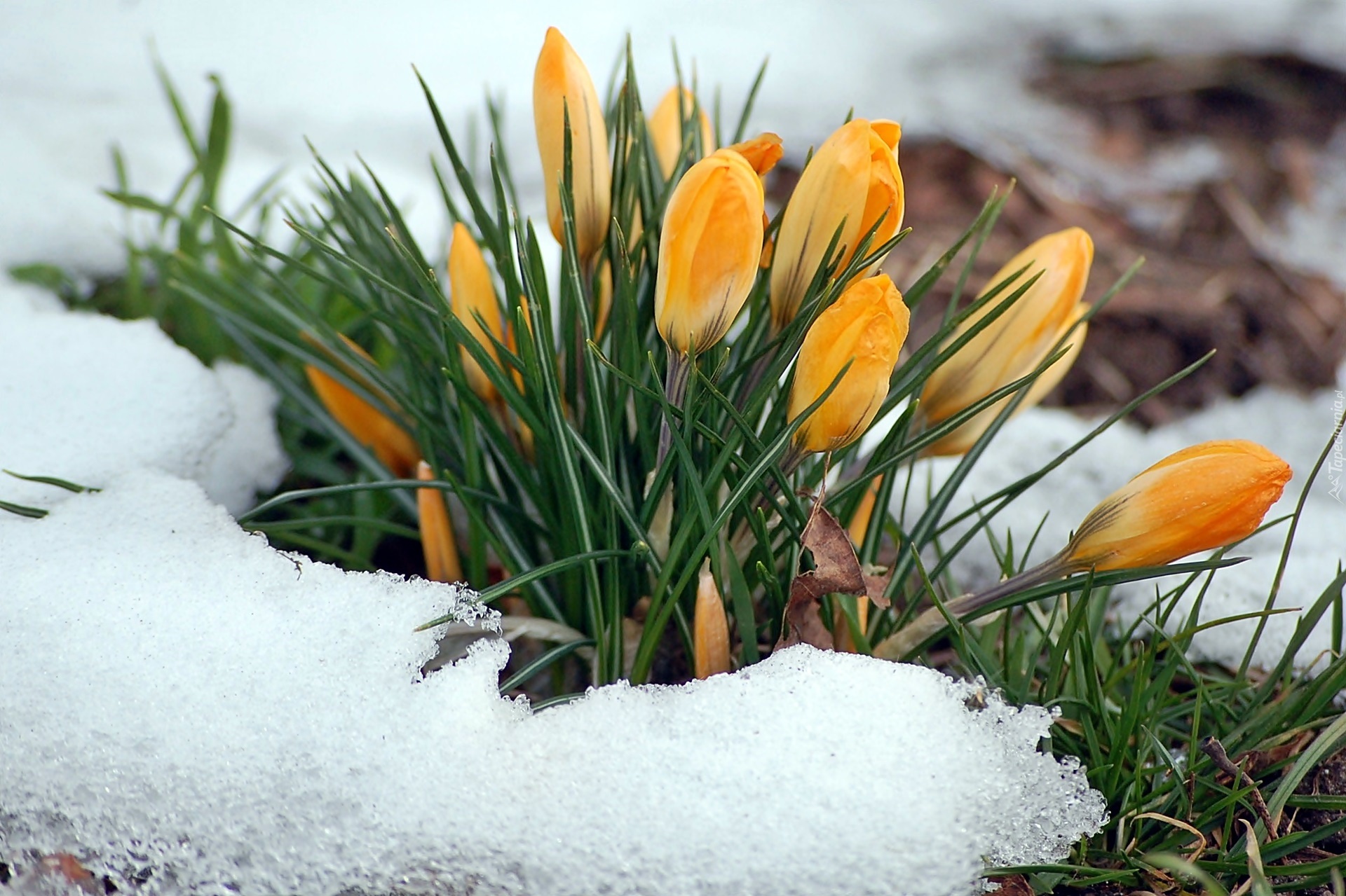 Edytor tapety: Wiosna, Kępa, Żółtych, Krokusów, Śnieg, Rozmycie