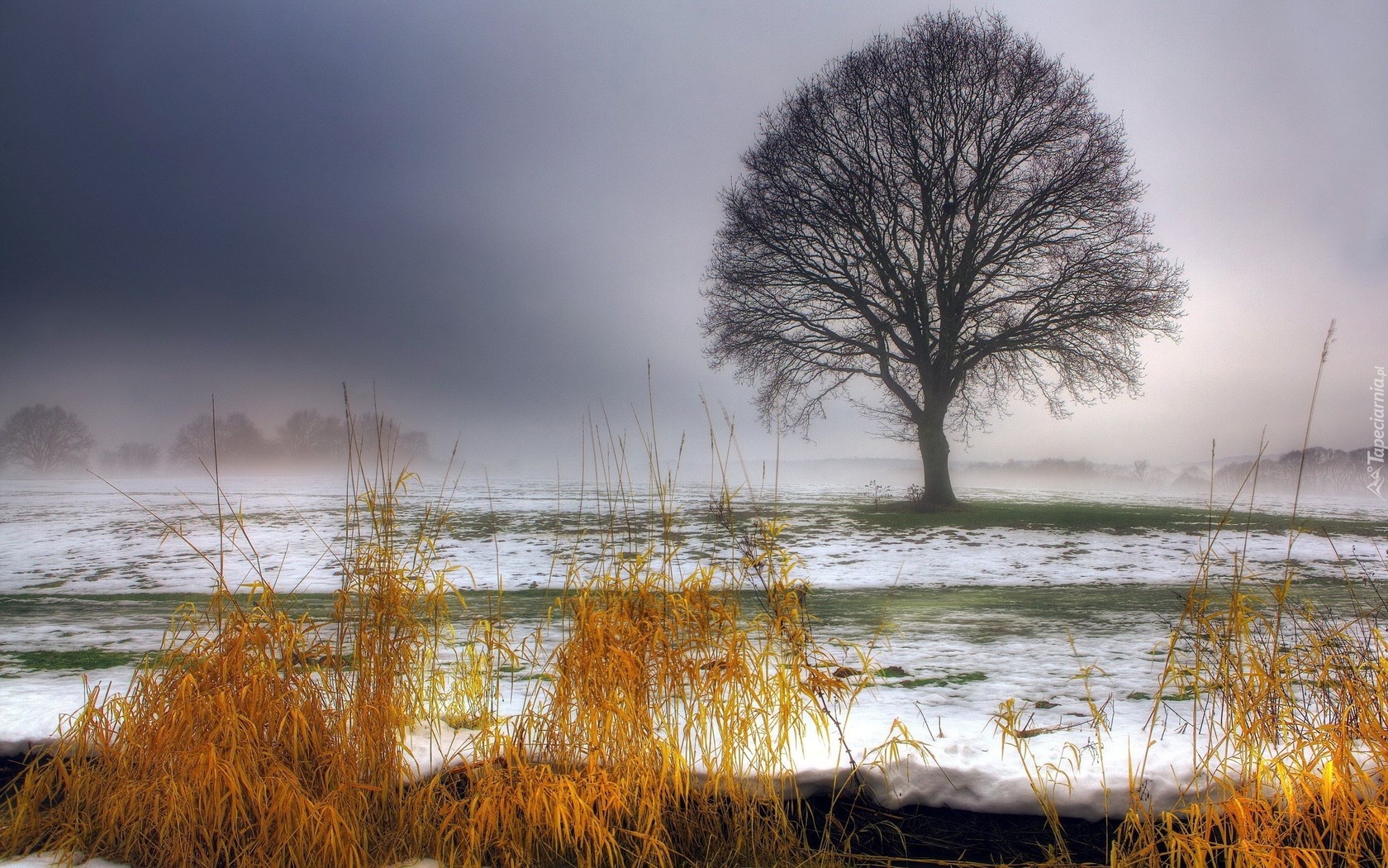 Edytor tapety: Mgła, Śnieg, Drzewo, Suche, Trawy