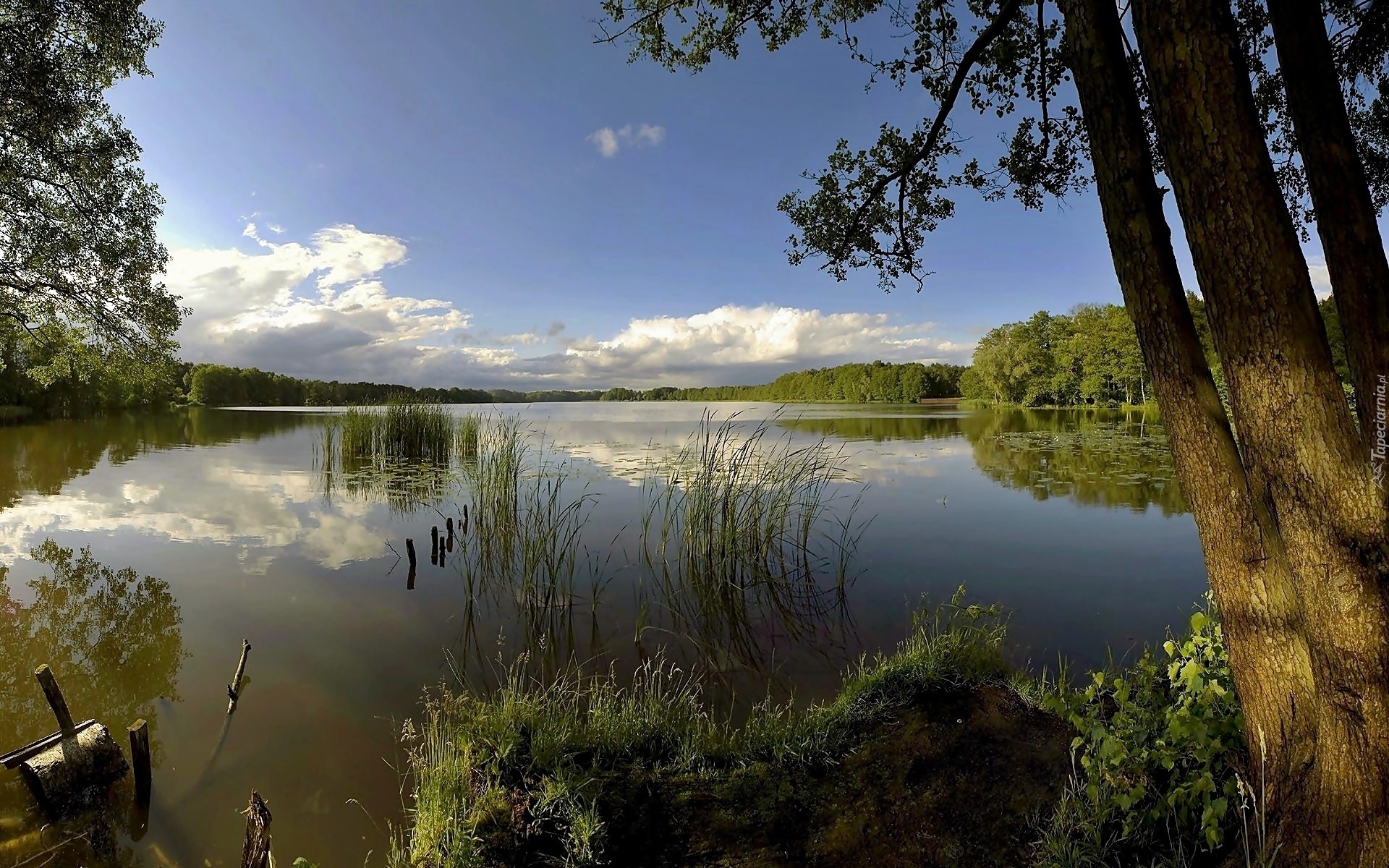 Edytor tapety: Lato, Chmury, Lasy, Jezioro, Trzciny