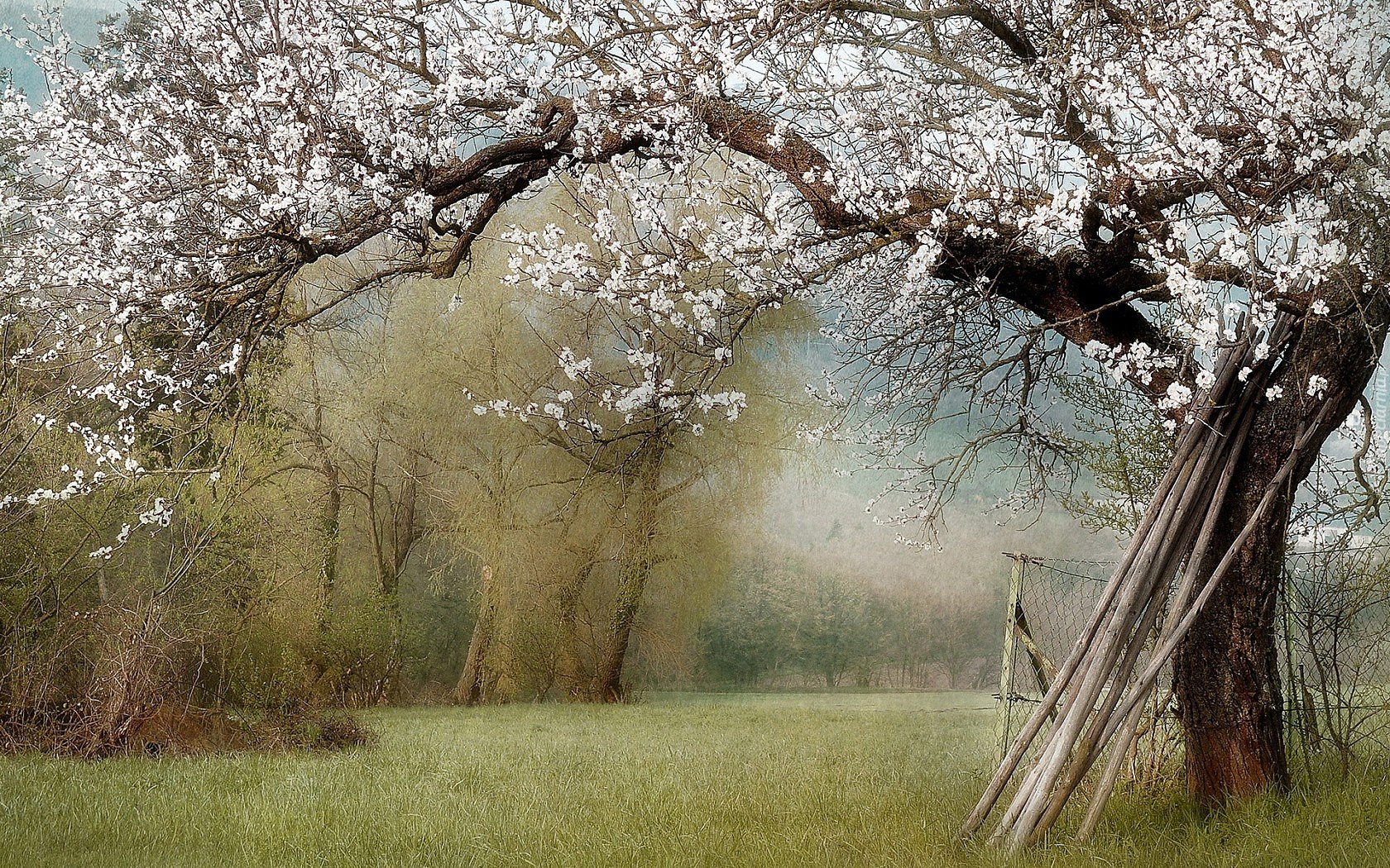 Edytor tapety: Malarstwo, Obraz, Ogródek, Drzewo, Okwiecone, Płotek