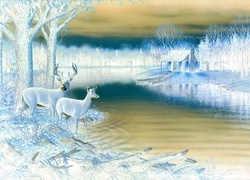 Edytor tapety: Jeleń, Łania, Domek, Las, Jezioro