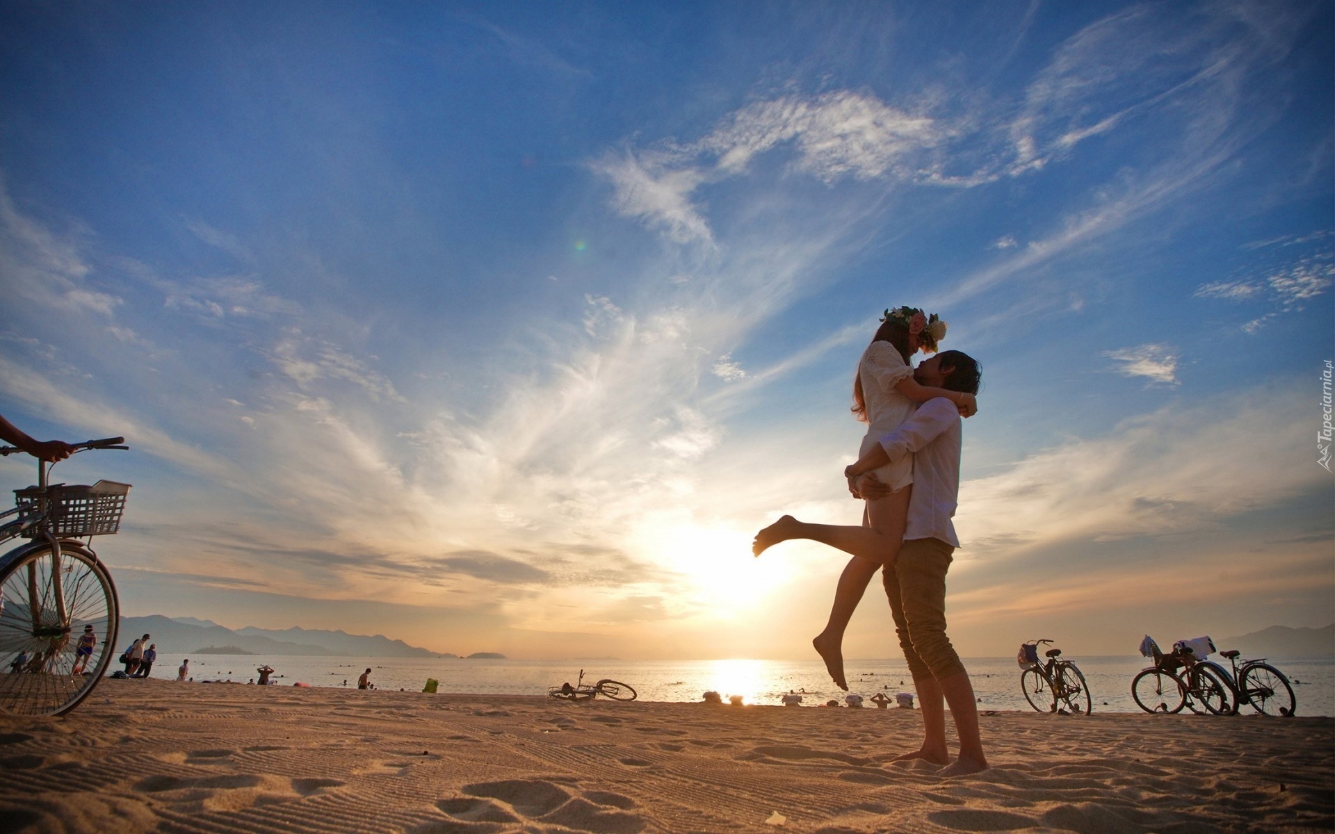 Edytor tapety: Zakochana, Para, Plaża, Rowery, Ludzie, Morze, Chmury