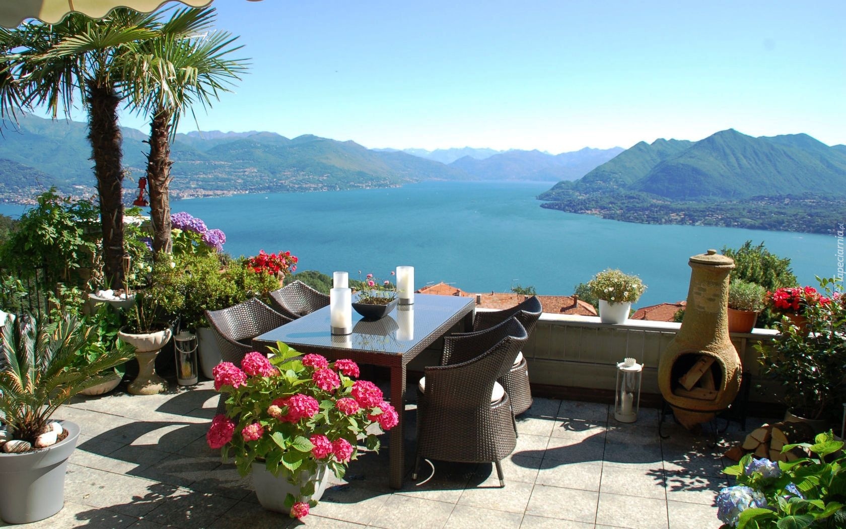 Edytor tapety: Góry, Jezioro, Taras, Kwiaty, Palmy