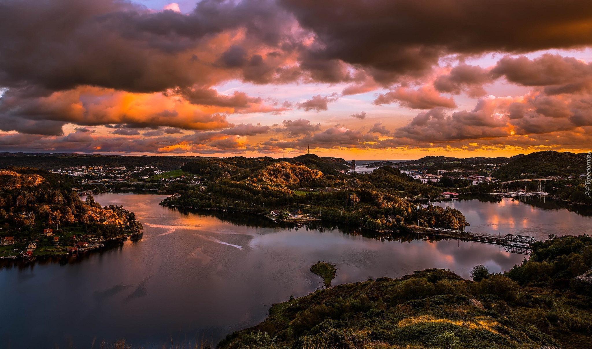 Edytor tapety: Rzeka, Most, Wzgórza, Zachód Słońca, Egersund, Norwegia