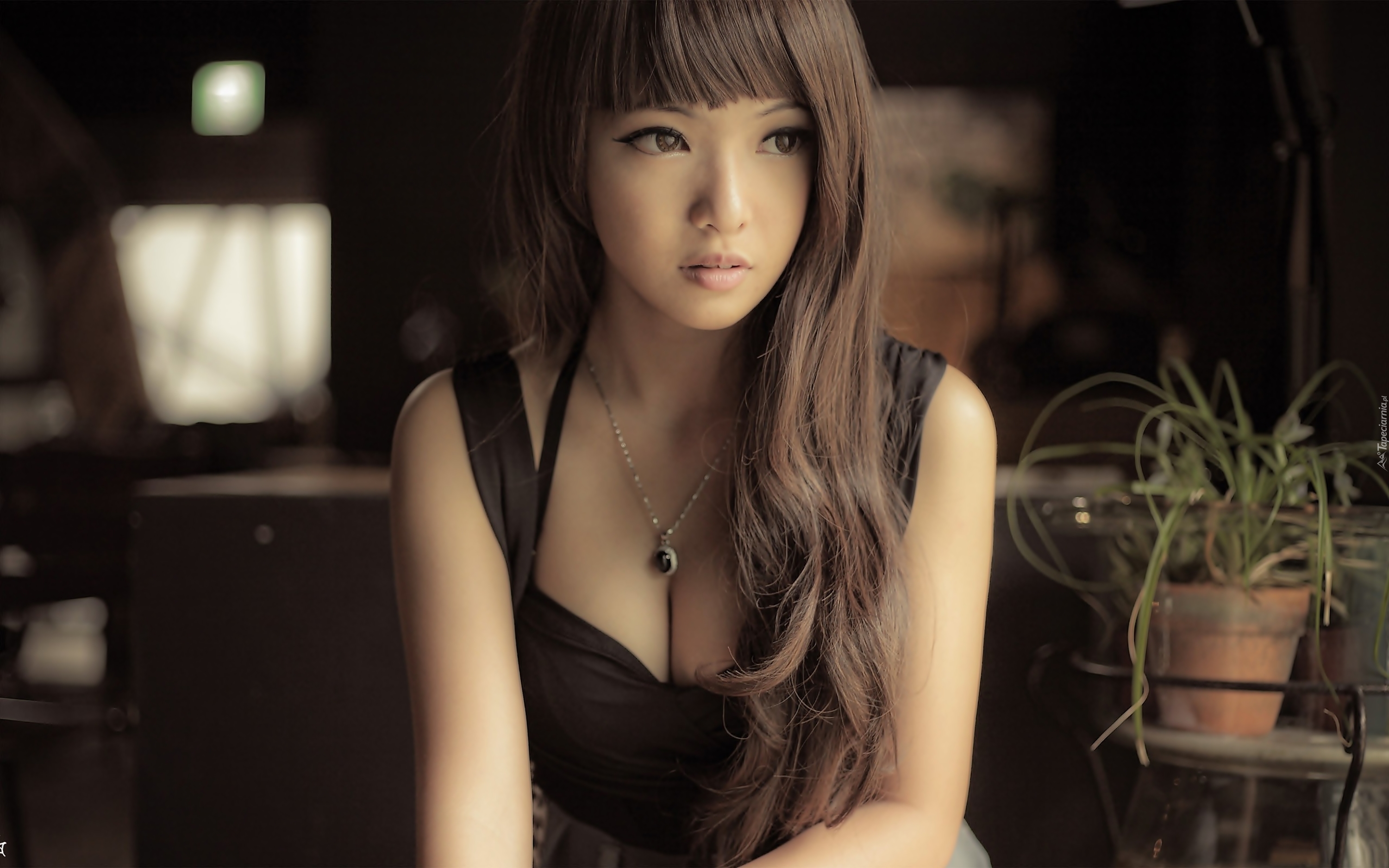 Edytor tapety: Brunetka, Długie, Włosy, Zamyślona, Naszyjnik