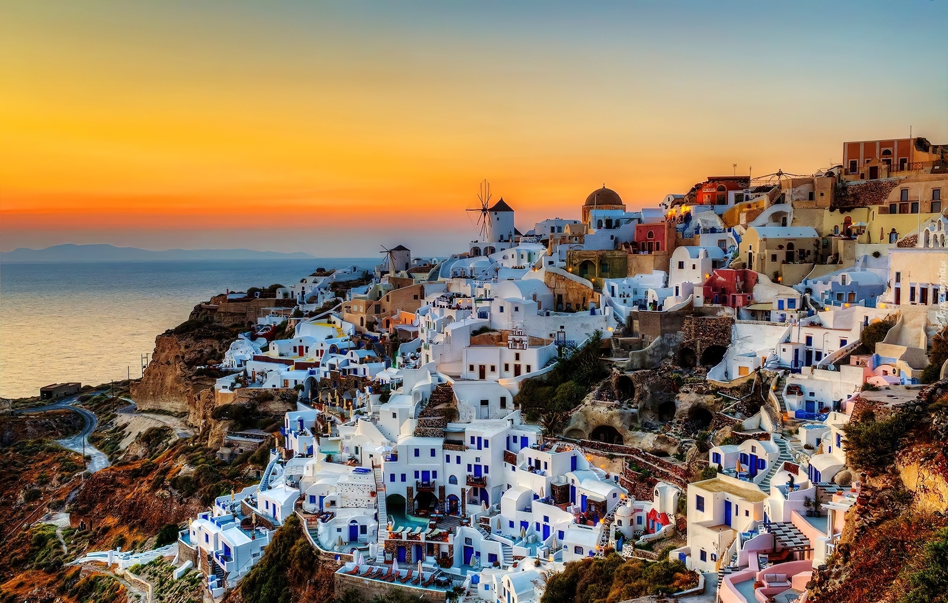 Edytor tapety: Zachód, Słońca, Skały, Wyspa, Santorini