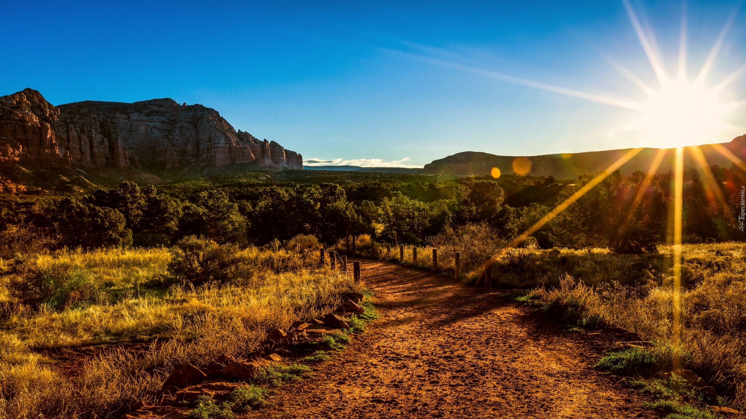 Edytor tapety: Droga, Góry, Promienie Słońca
