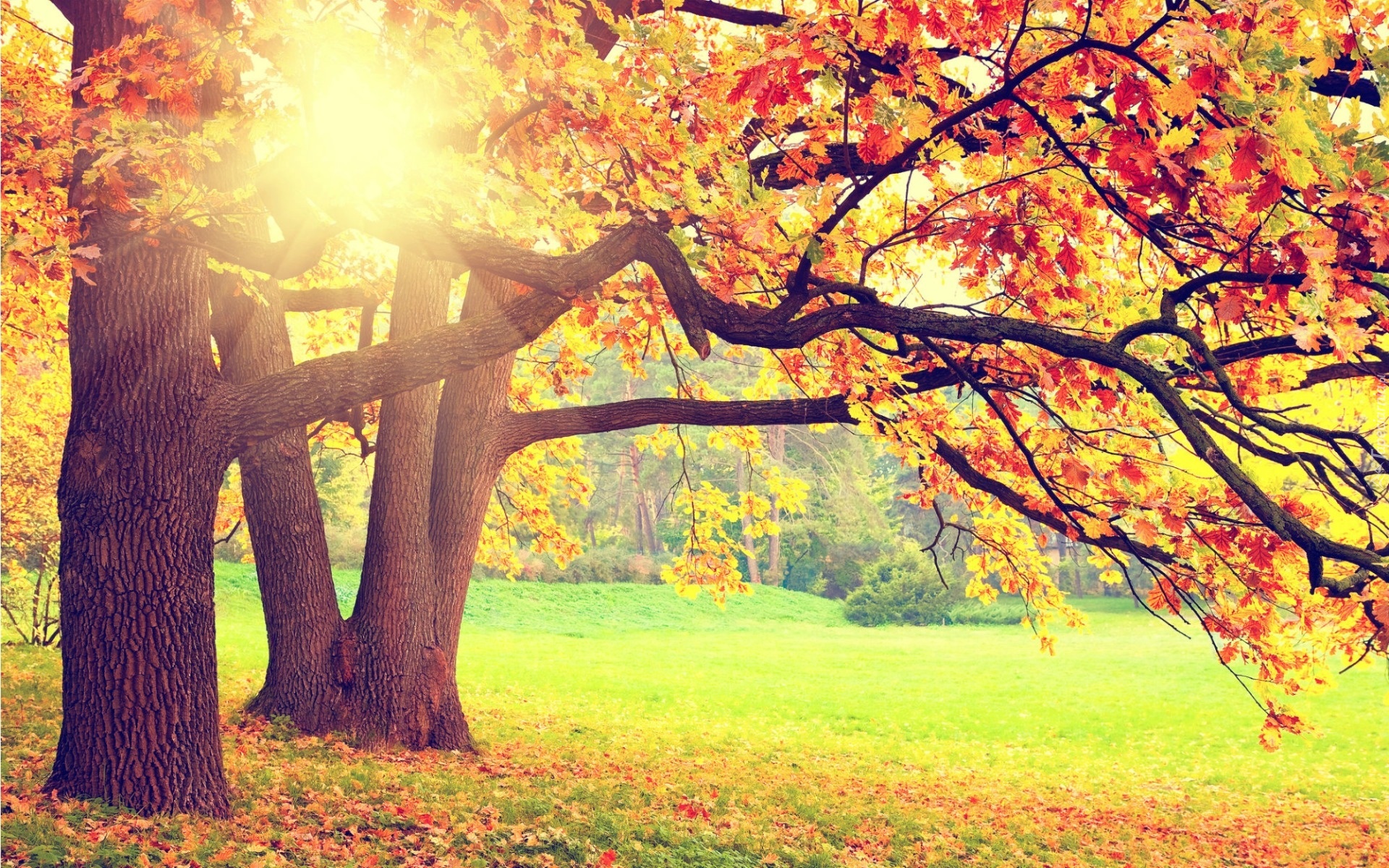 Edytor tapety: Park, Drzewa, Kolorowe, Liście, Promienie, Słońca, Jesień