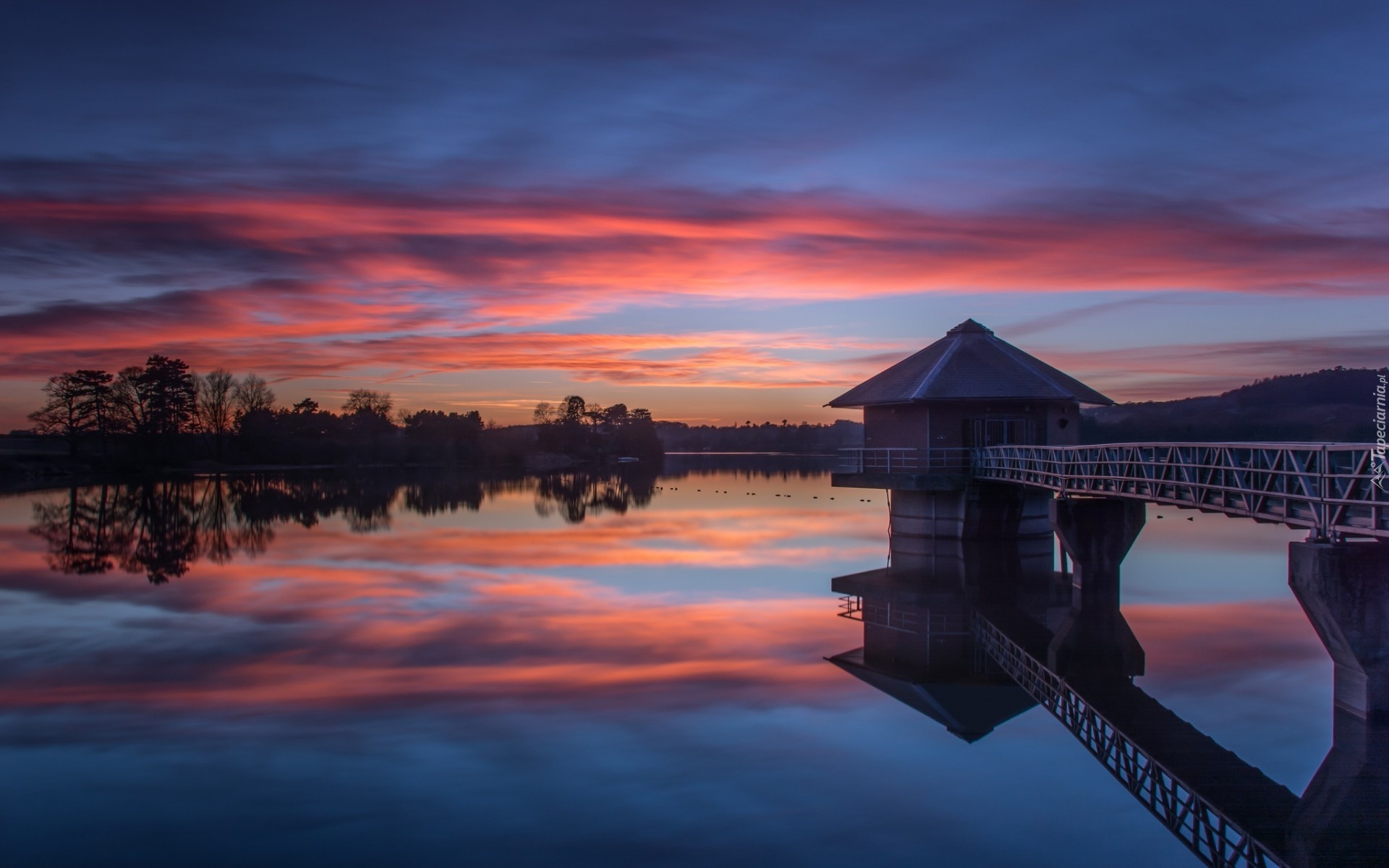 Edytor tapety: Jezioro, Pomost, Domek, Lasy, Zachód, Słońca
