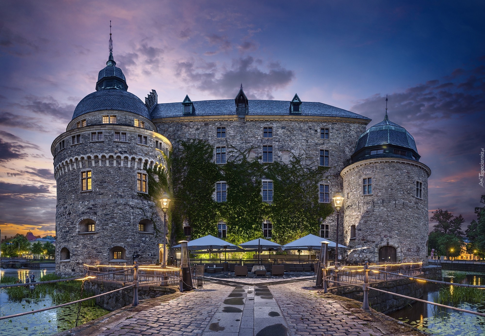Edytor tapety: Zamek, Most, Fosa, Latarnie, Zachód, Słońca