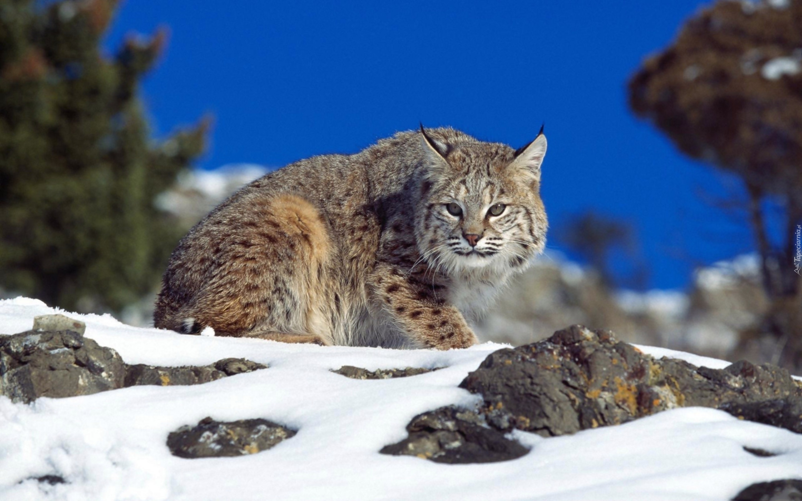 Edytor tapety: Zima, Ryś, Ośnieżone, Skały, Roślinność, Rozmycie