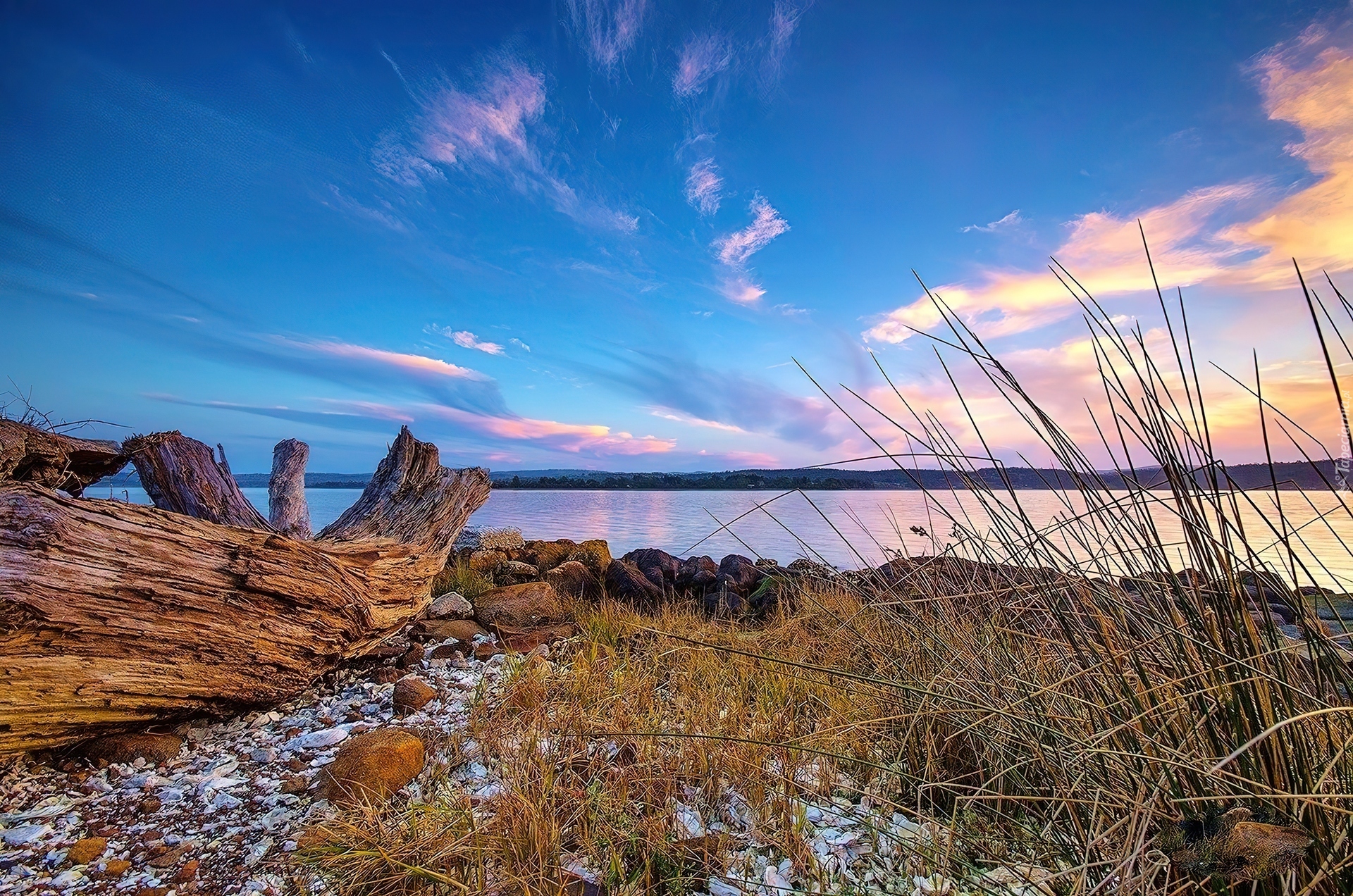 Edytor tapety: Zachód, Słońca, Kłoda, Jezioro, Trzciny