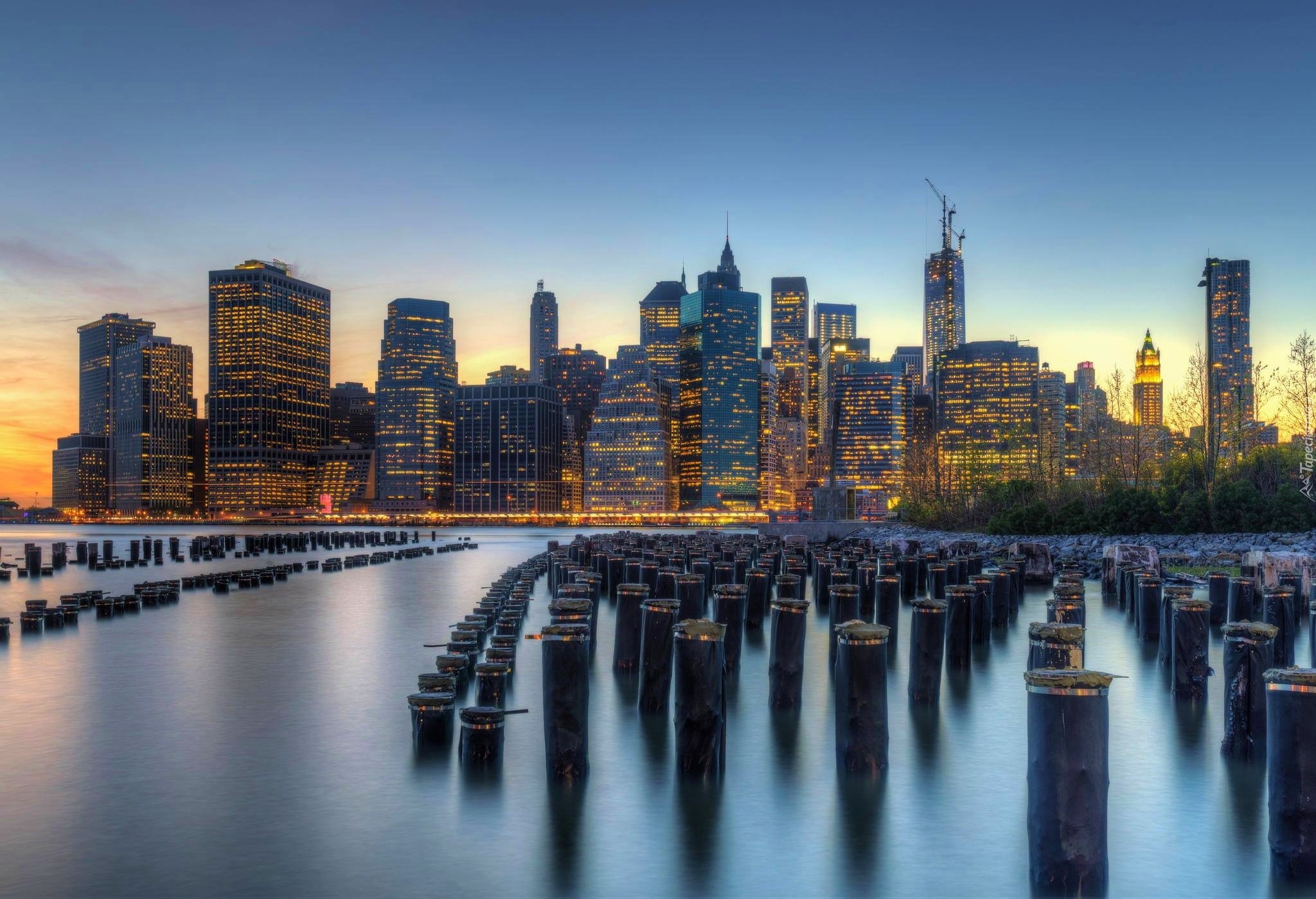 Edytor tapety: Wieżowce, Woda, Pale