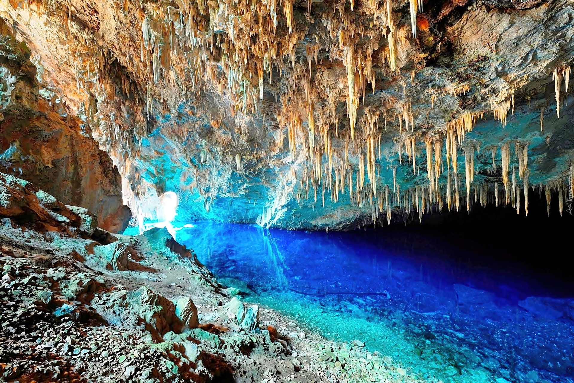 Edytor tapety: Bonito, Jaskinia, Blue, Lake, Cave, Jezioro, Stalaktyty