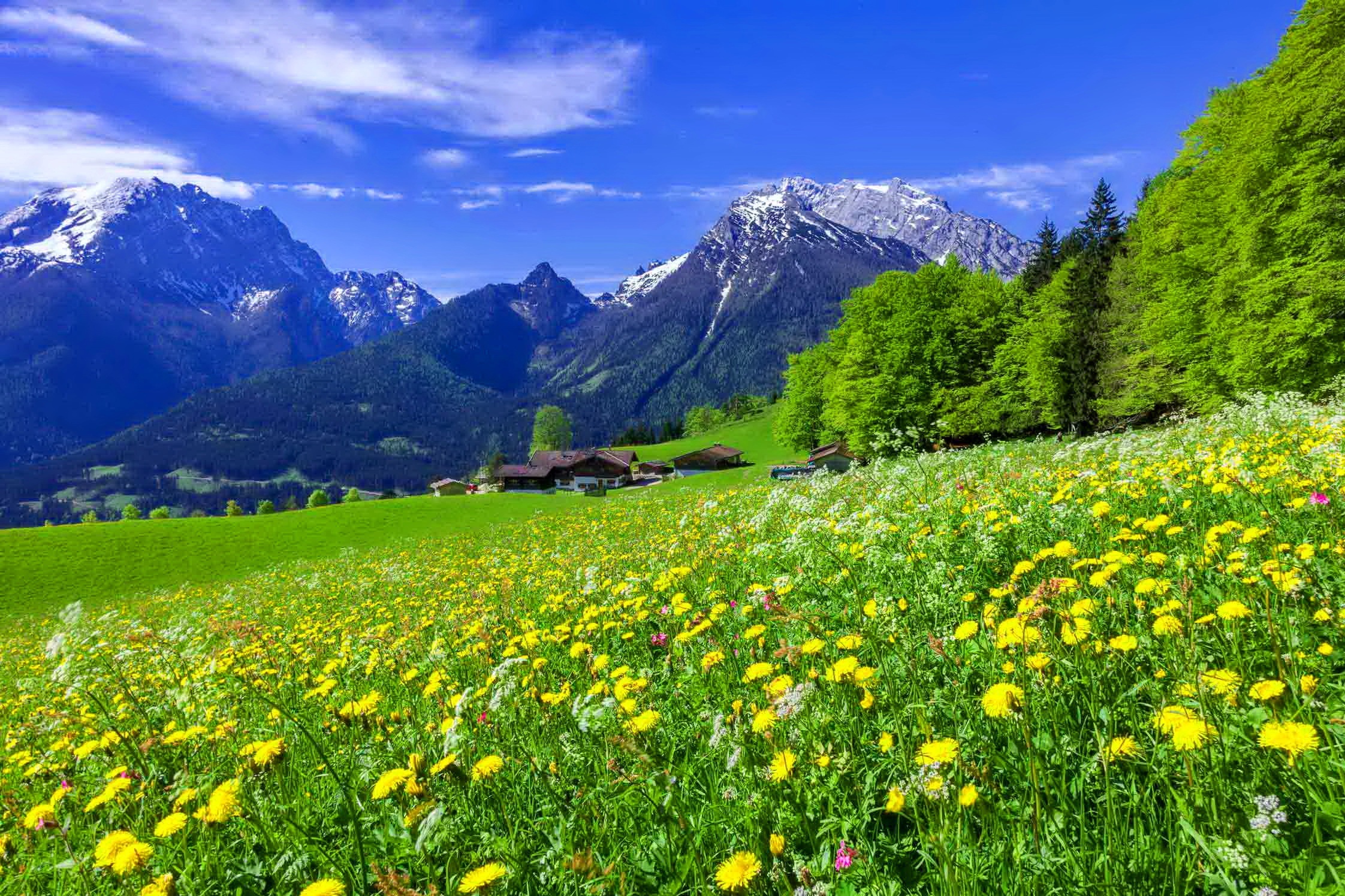 Edytor tapety: Łąka, Kwiaty, Góry, Lasy, Domy, Wiosna
