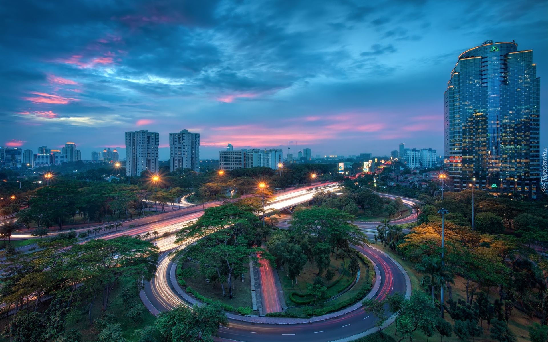 Edytor tapety: Wieżowce, Ulice, Drzewa, Dżakarta, Stolica, Jndonezji, Zachód, Słonca