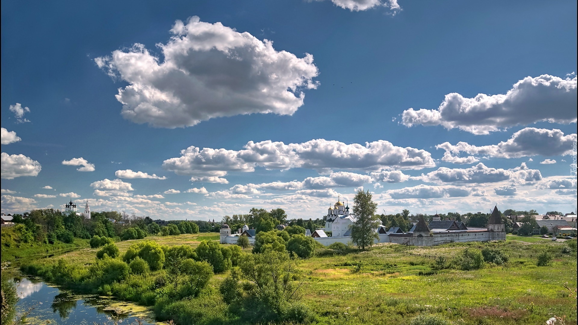 Edytor tapety: Chmury, Rzeka, Łąki, Pokrovsky, Monaster, Cerkwie