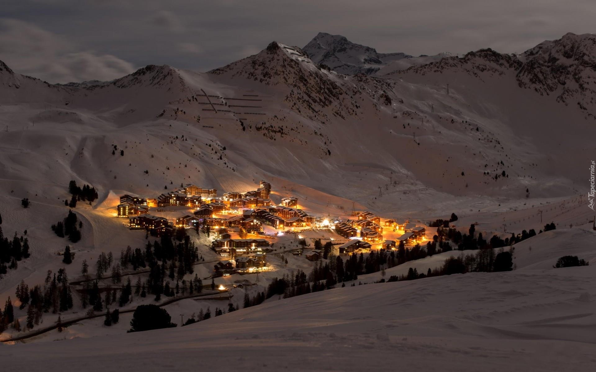 Edytor tapety: Oświetlone, Miasteczko, Domy, Drzewa, Góry, Zima