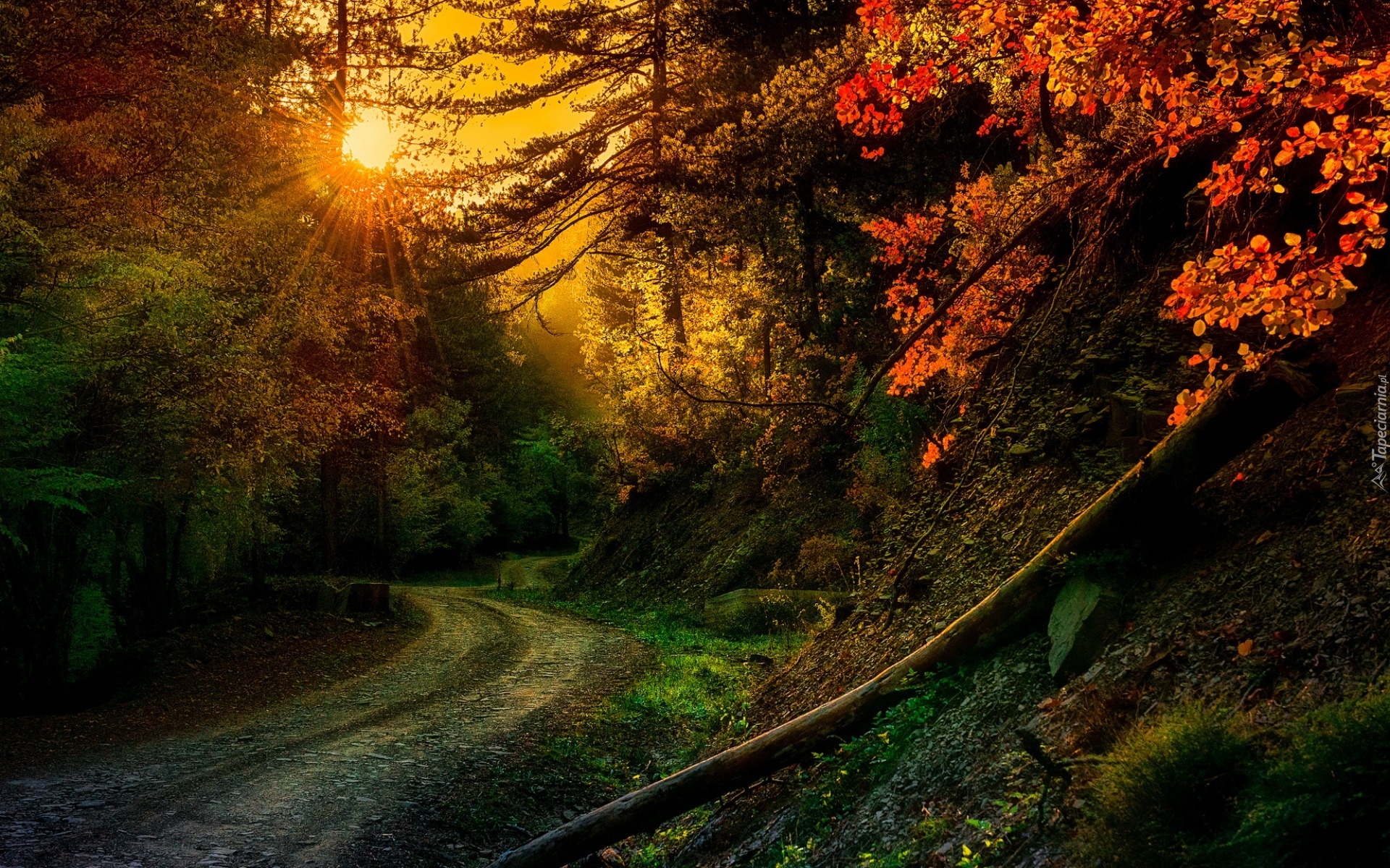 Edytor tapety: Las, Droga, Promienie, Słońca, Jesień